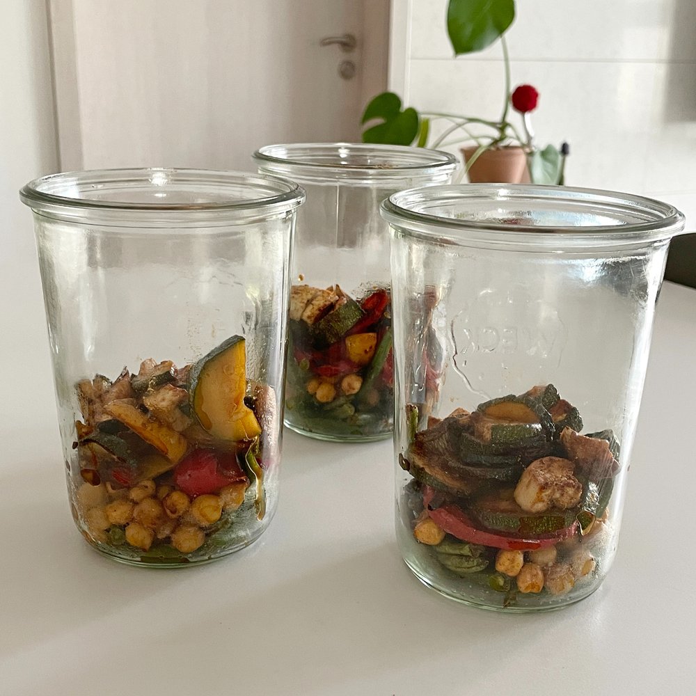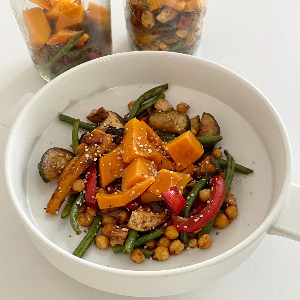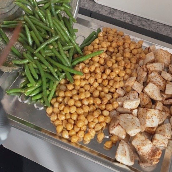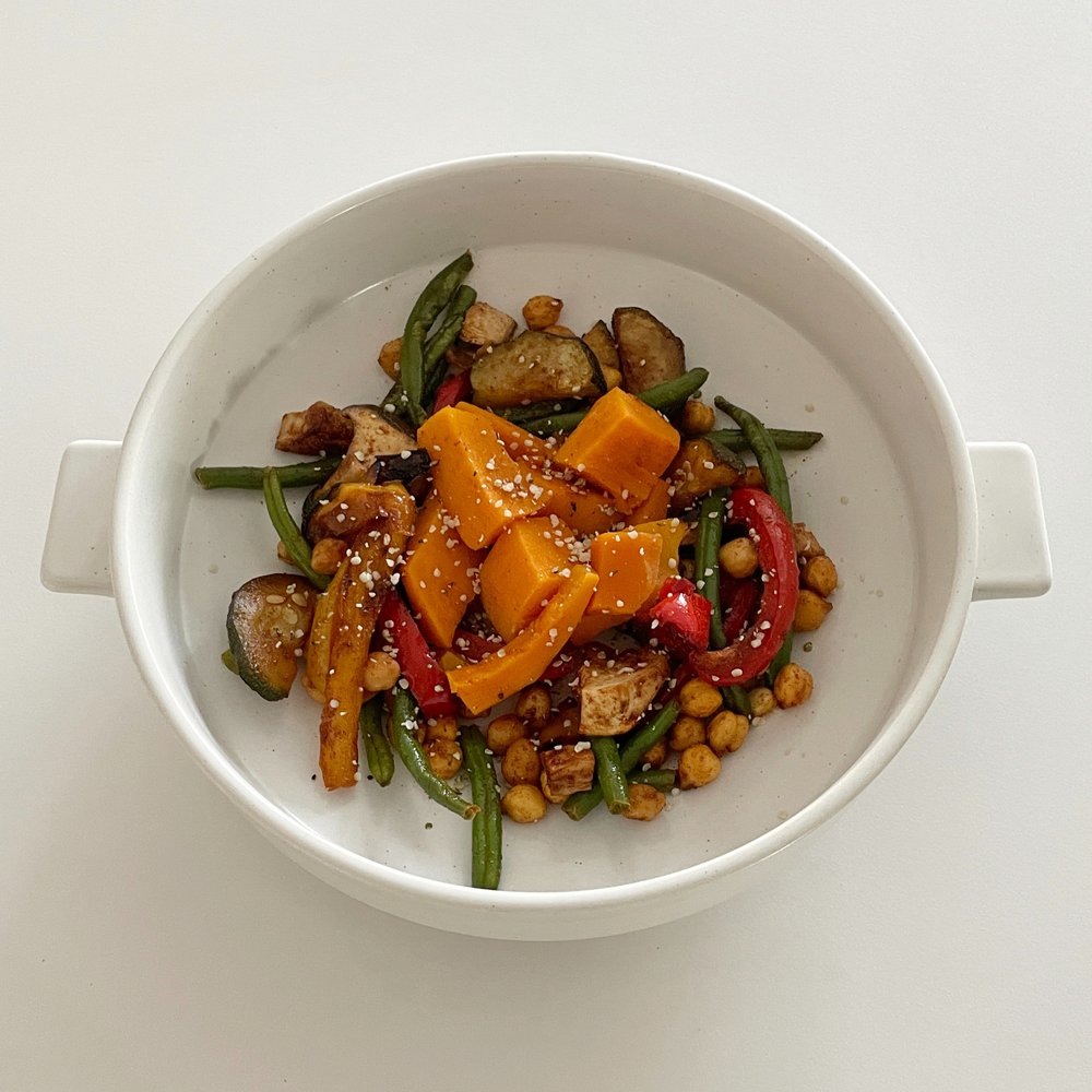 - 병아리콩 80~100g, 쥬키니 1/4개, 파프리카 1/2개, 엑스트라 버진 올리브유 or 아보카도 오일, 단호박 100g, 버섯 반개, 그린빈 한 움큼