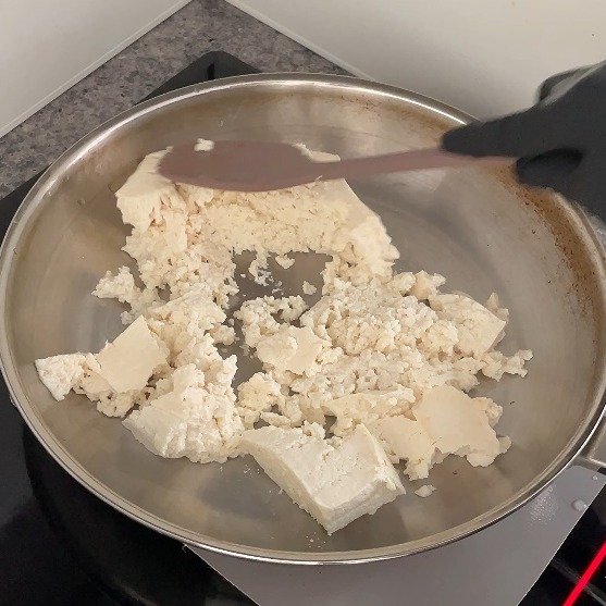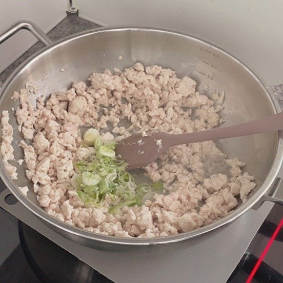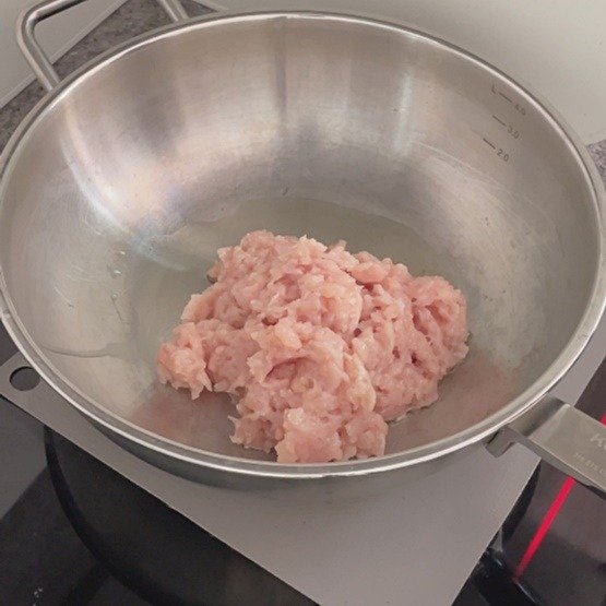 1. 닭 가슴살을 잘게 다지고, 중불에 달궈진 팬에 오일과 함께 볶아줍니다.