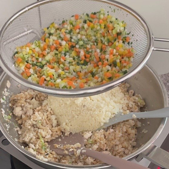 4. 세척해둔 컬리플라워 라이스와 레인보우 베지터블을 넣어 잘 섞으며 볶아줍니다.