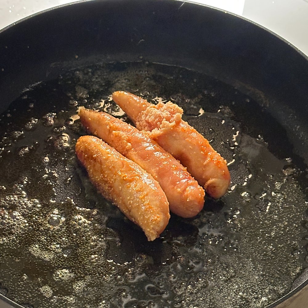 아삭아삭한 오이 먹기 좋게 썰어주고, 버터에 명란을 구워 주면 끝.
