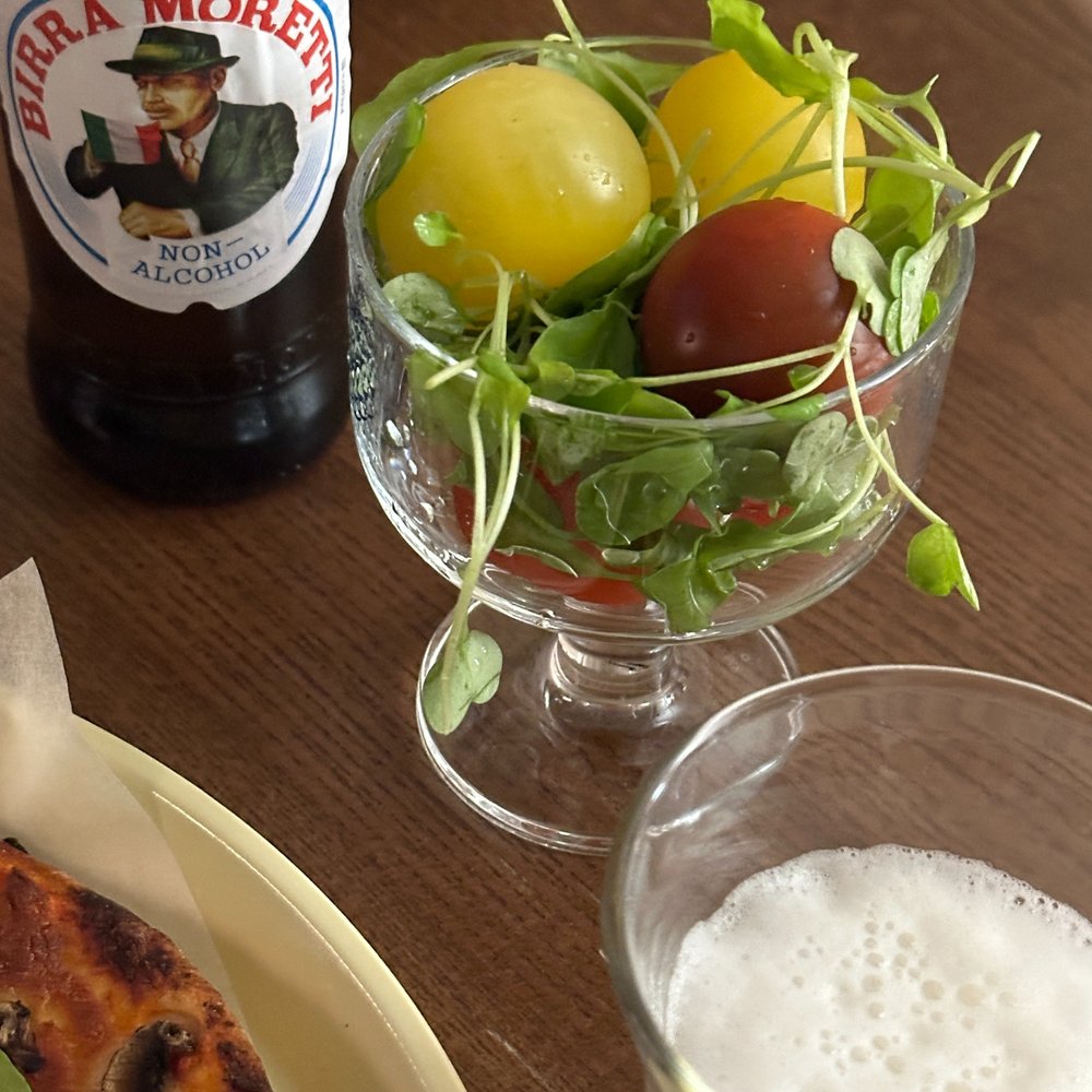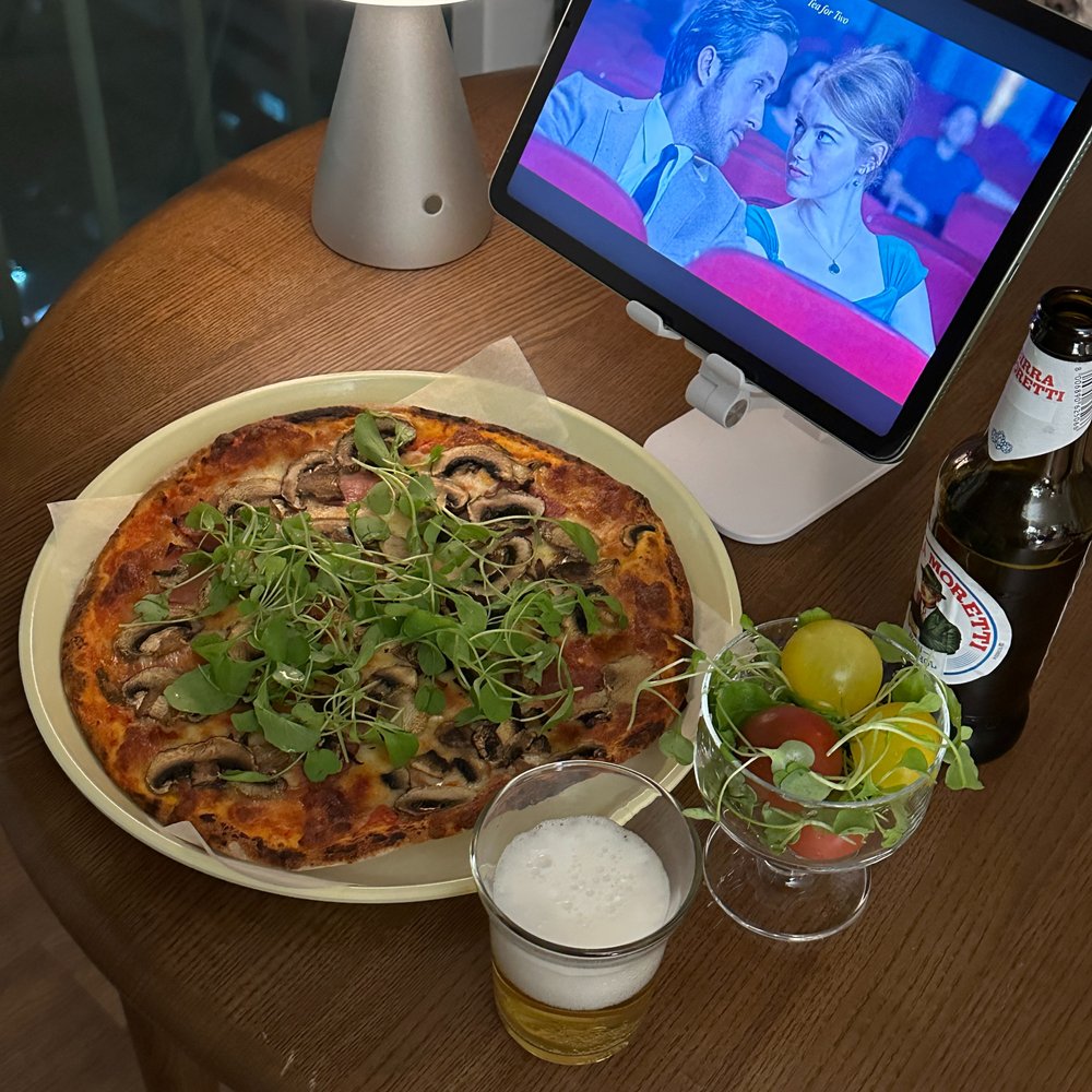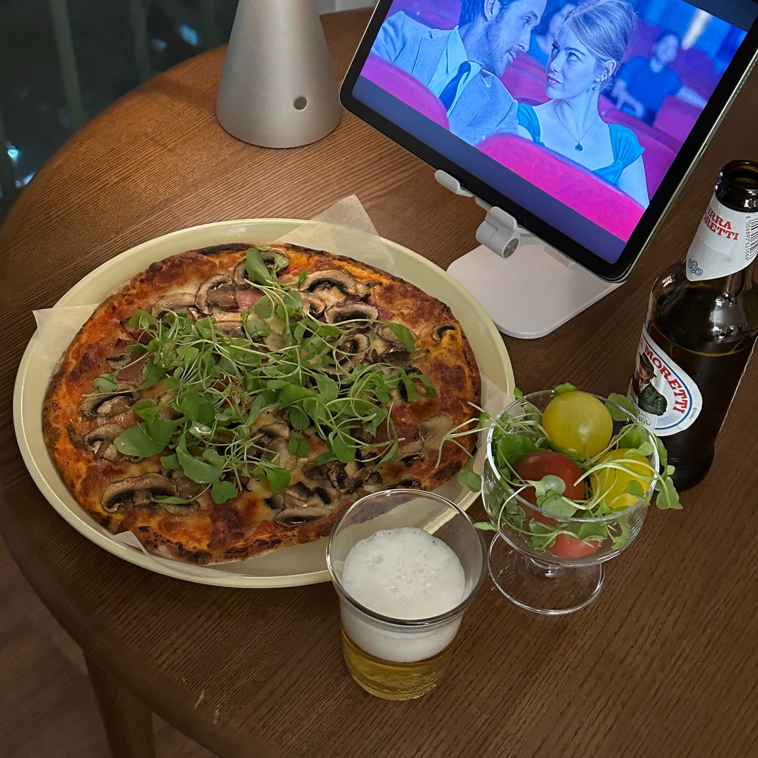 도우가 두껍지 않은 피자라 부담도 없고 저녁 대신 먹으면 혼자서 한판 가능하겠더라고요. 피클 대신에 상큼한 루꼴라 토마토 샐러드를 곁들어 먹었어요.