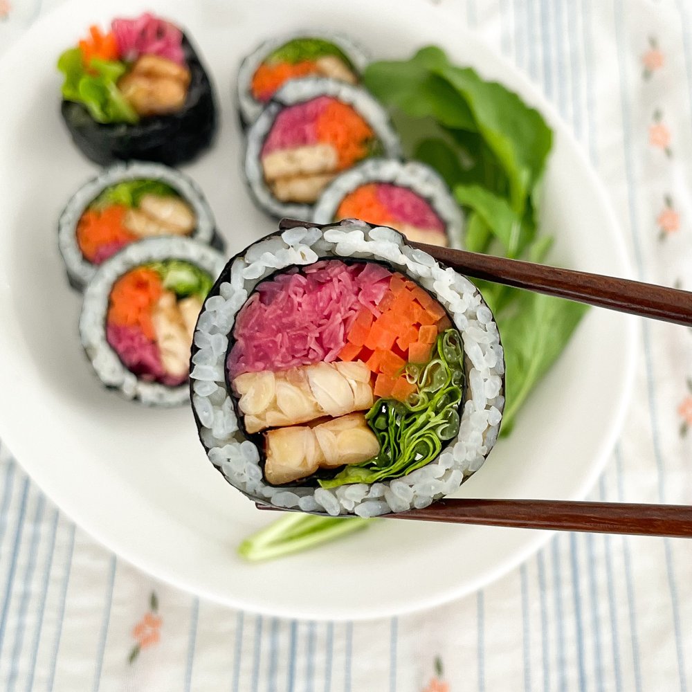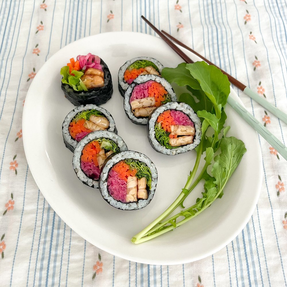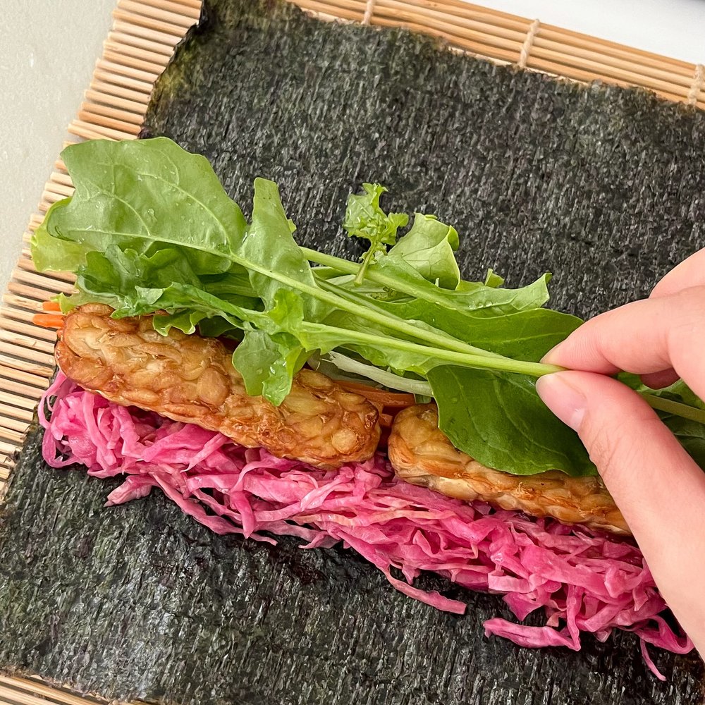 아삭아삭한 루꼴라 믹스에 노릇노릇 구워낸 고소한 템페와 상큼한 적채 피클이 더해져 마치 봄처럼 산뜻한 김밥이 완성된답니다.