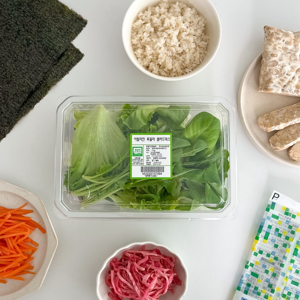 ∙ 재료 : 밥 2/3공기(+소금 0.3+참기름 0.5), 김밥용 김 1장, 구운 템페 1/3개 분량, 이탈리안 루꼴라 샐러드믹스 2줌, 채 썰어 볶은 당근 1/6개 분량, 적채 피클 20g