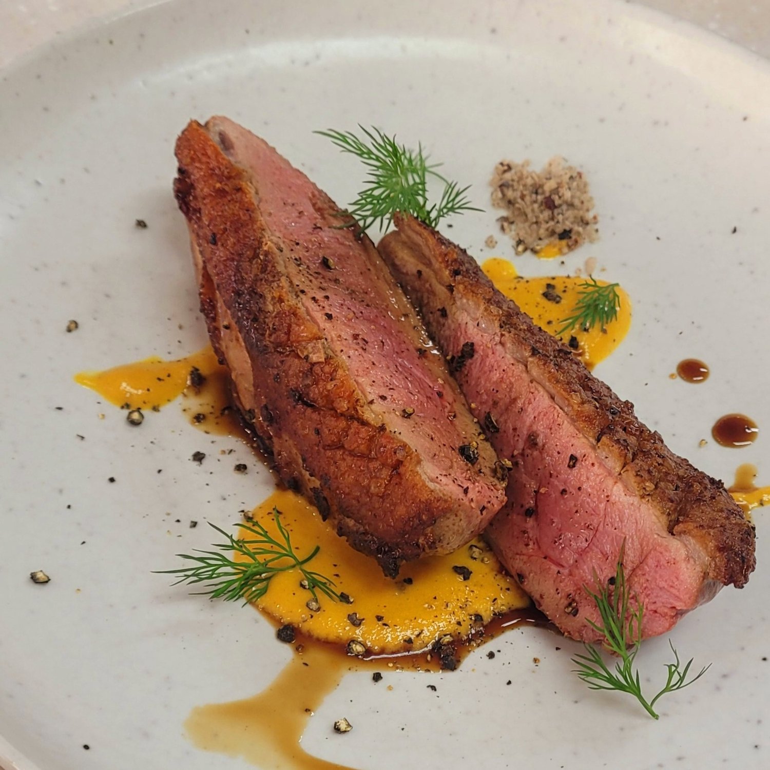 마지막으로 통후추와 딜을 군데군데 "무심한듯" 뿌려주고 올려주시면, 오늘의 요리는 완성입니다! 오리 가슴살 스테이크의 장점은 우선 색다른 재료로 분위기있게 한끼를 먹을 수 있다는 점과 (물론 건강식이죠, 요건 두말하면 입아프니까 넘어갈게요) 설거지거리가 많이 나오지 않는다는 점입니다 ㅎㅎㅎㅎㅎ