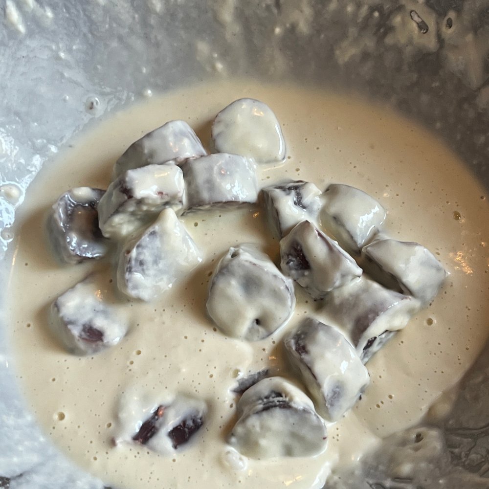순대와 튀김가루만 있다면 끝나는 끝내주는 요리거든요. 순대를 알맞은 크기로 잘라서 튀김 반죽에 묻혀주고 튀기기만 하면 끝!