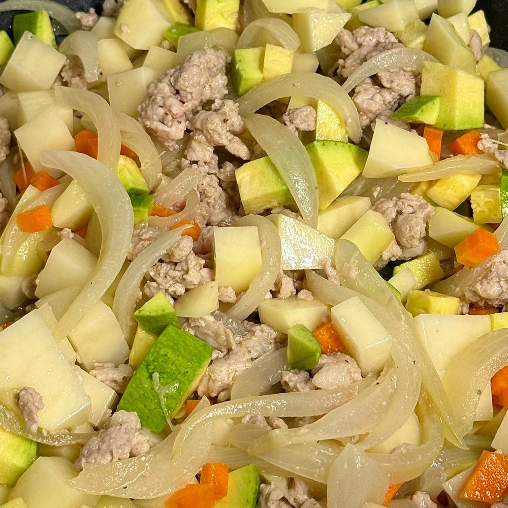 3. 양파가 갈색빛을 띄면 다짐육에 맛술 한 숟갈 넣어 익혀주세요.
