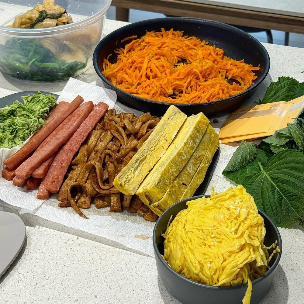 2. 볶은 당근, 치즈, 깻잎 등 준비한 재료를 가운데 올려주세요.