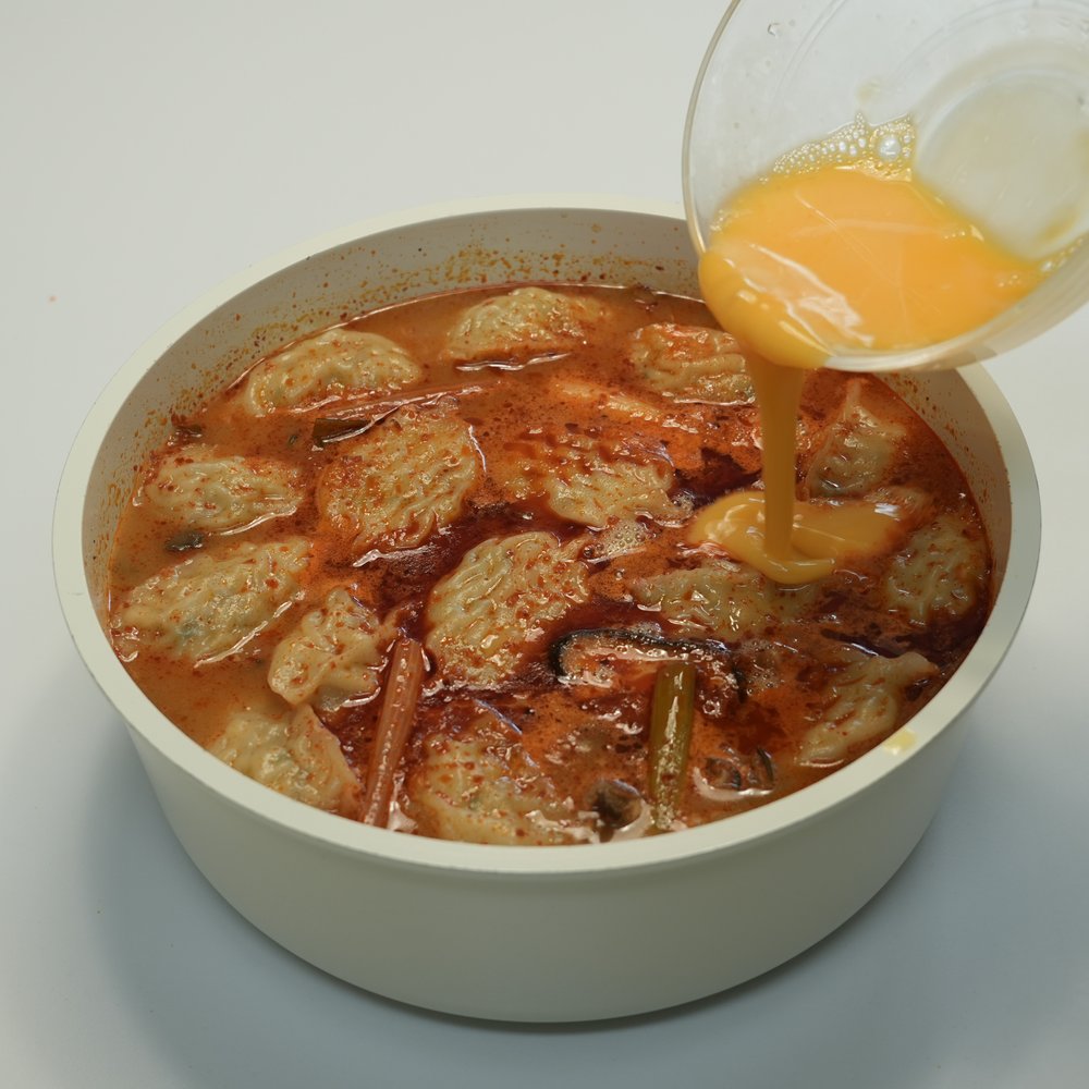7. 만두가 떠오르면 삶은 우동면을 넣고, 계란을 풀어 빙 둘러 넣어요.