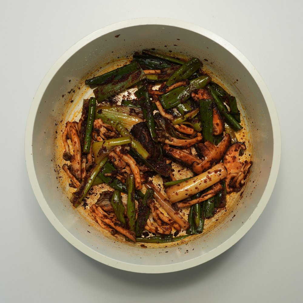 4. 버섯을 넣고 수분이 나오도록 볶다가 진간장 1T를 둘러 간장 향을 더해요.