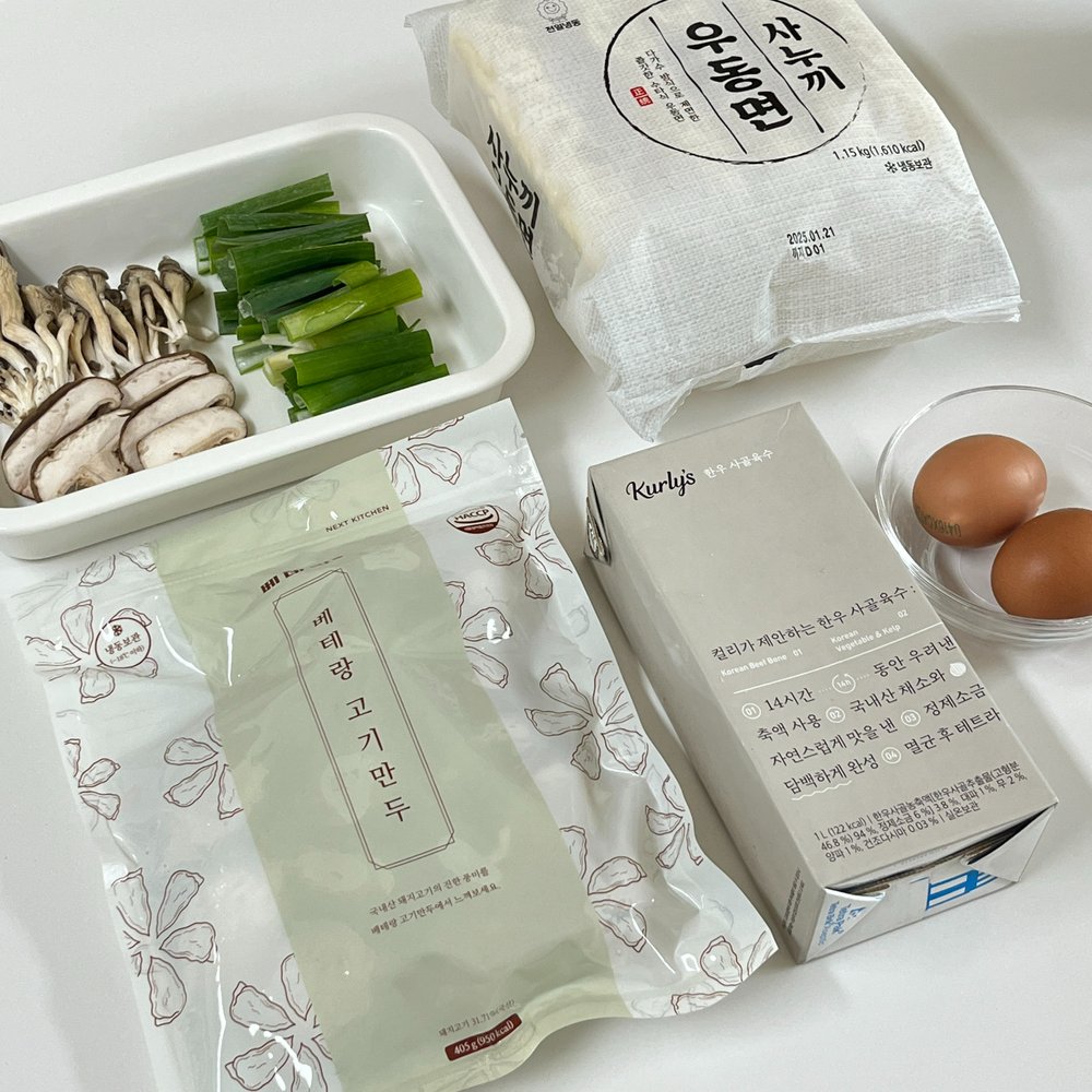 쫀쫀한 만두피와 고소한 속으로 채운 '베테랑 고기만두'와 마켓컬리의 사골육수만 있다면 금세 만들 수 있어요. 버섯, 대파, 계란 등 나머지는 냉장고에 있을법한 재료들로 꺼내 준비해요.