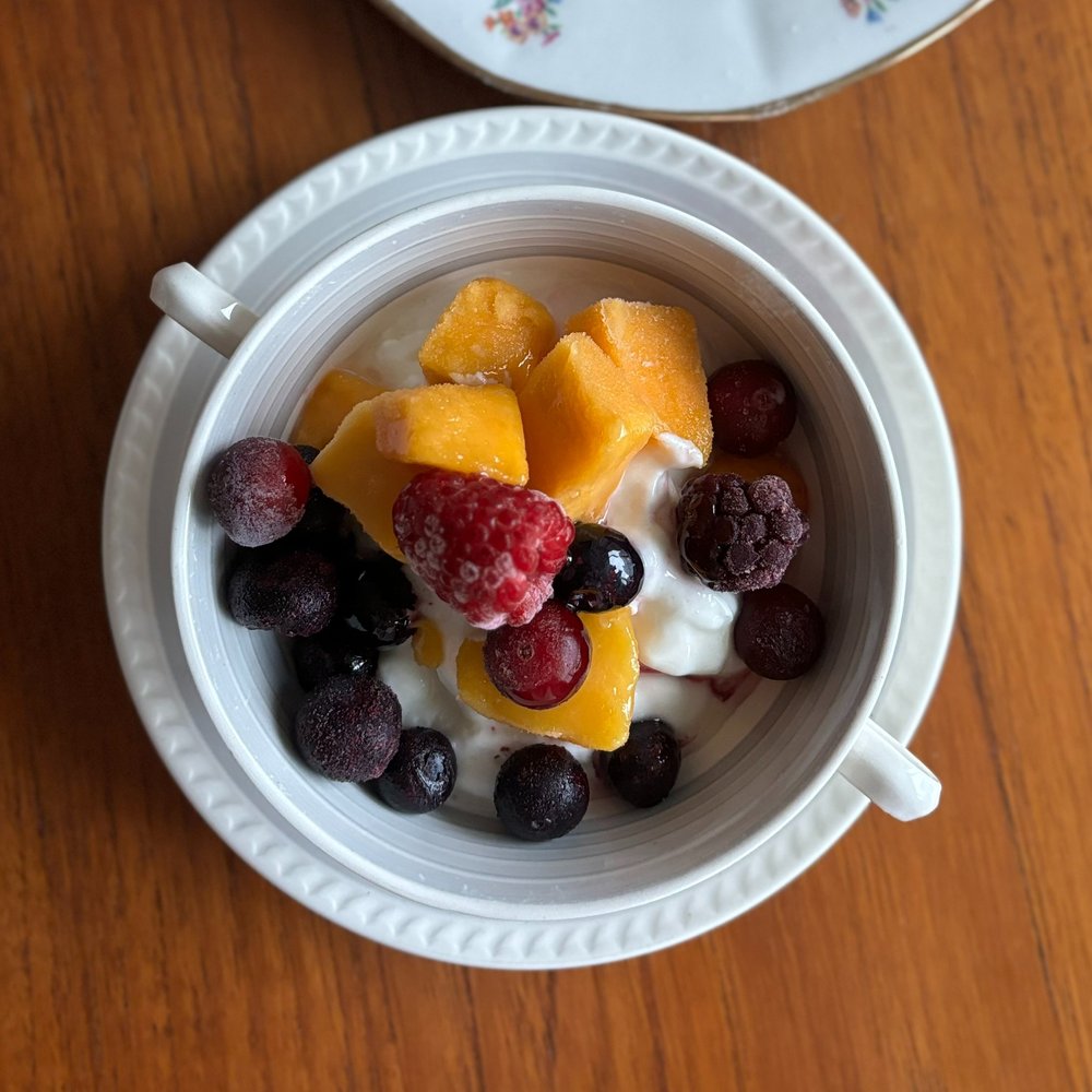 걸쭉하게 내린 요거트에 냉동 망고와 블루베리 등의 베리류를 넣어주면 얼마나 예쁘게요. 반짝이는 보석처럼 아름다워서 입으로 들어가기 아까울 정도에요. 바나나를 곁들여 넣어주시면 한 끼 식사로도 충분해요.