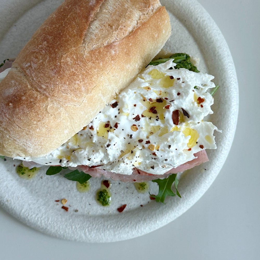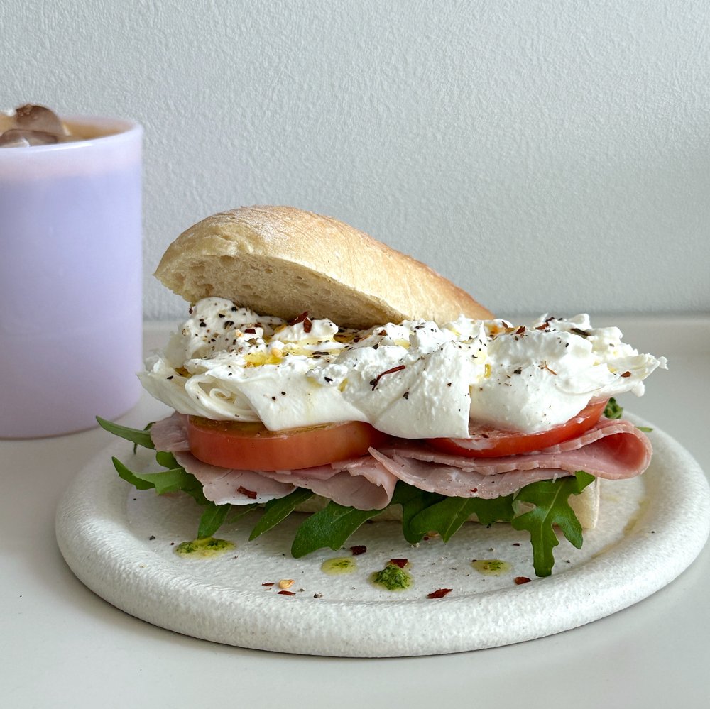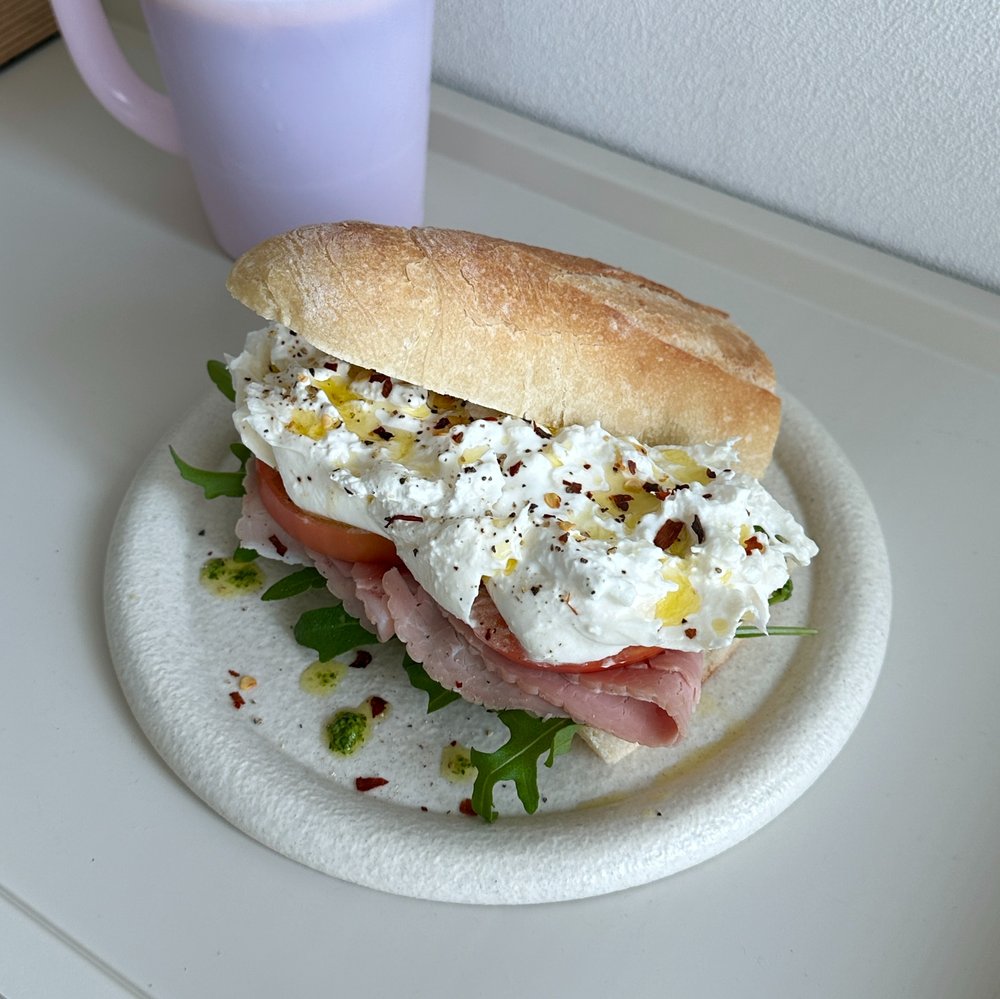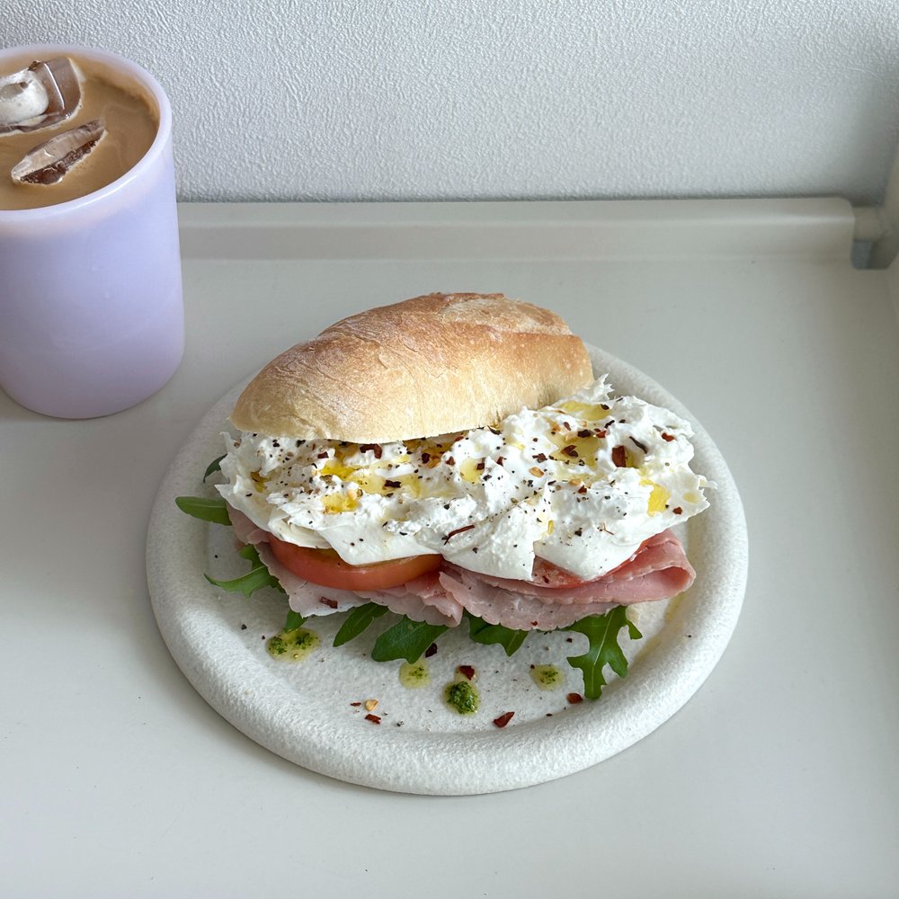 러프하게 찢어서 올린 부라타 치즈의 비쥬얼이 너무 마음에 드는 샌드위치에요. 보이는 것도 너무 예쁘지만 한 입 크게 베어 먹는 순간 유명한 브런치카페에 온 기분이 들게 하는 사랑스러운 샌드위치에요!