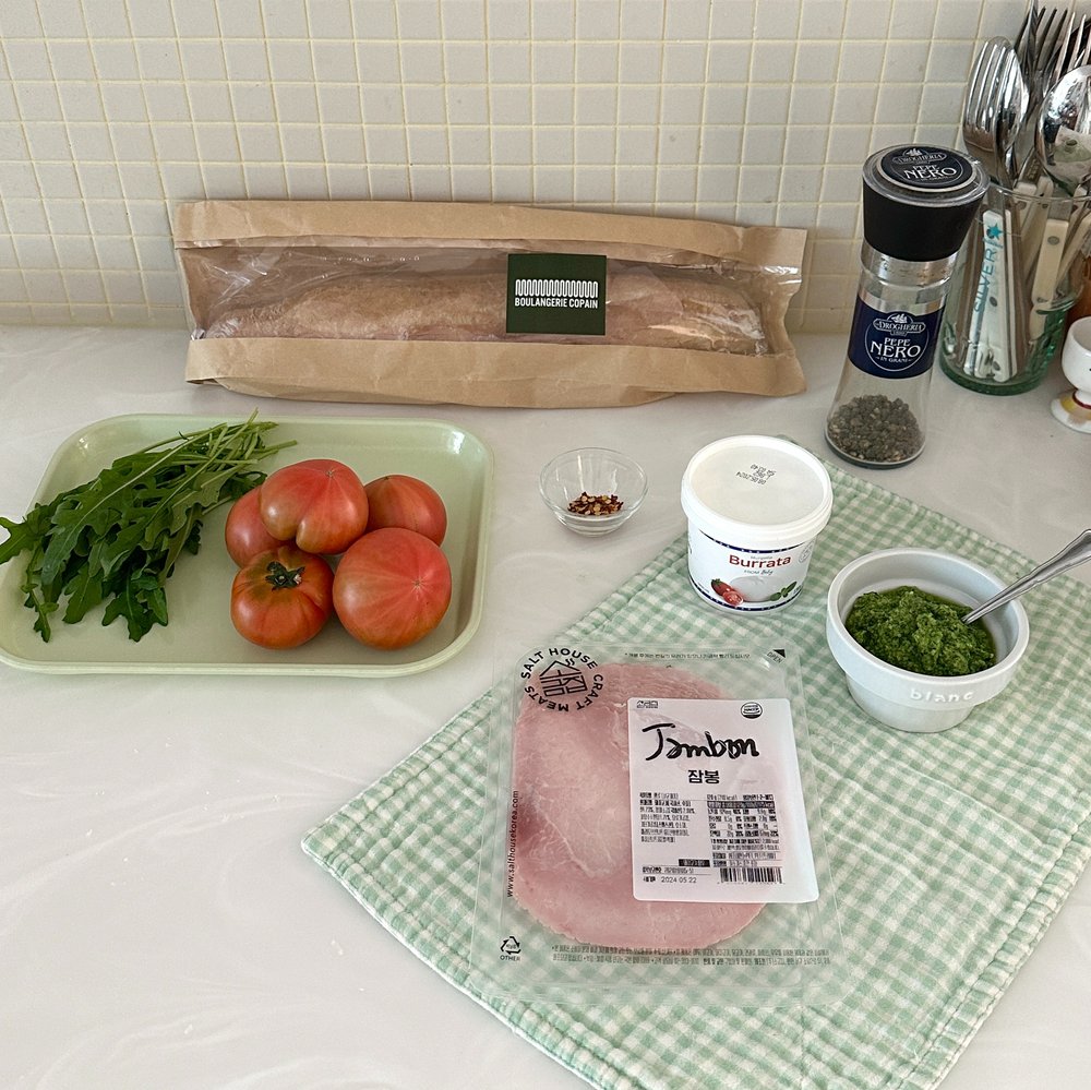 바질, 잠봉, 토마토, 부라타치즈의 맛의 조화가 환상적인 여름 맛 샌드위치 소개해 드릴게요! 신선한 재료만 갖춰져 있다면 만드는 방법은 아주 간단하니 부라타치즈를 좋아하신다면 꼭 한번 만들어 보시는 것을 추천해 드려요 😘