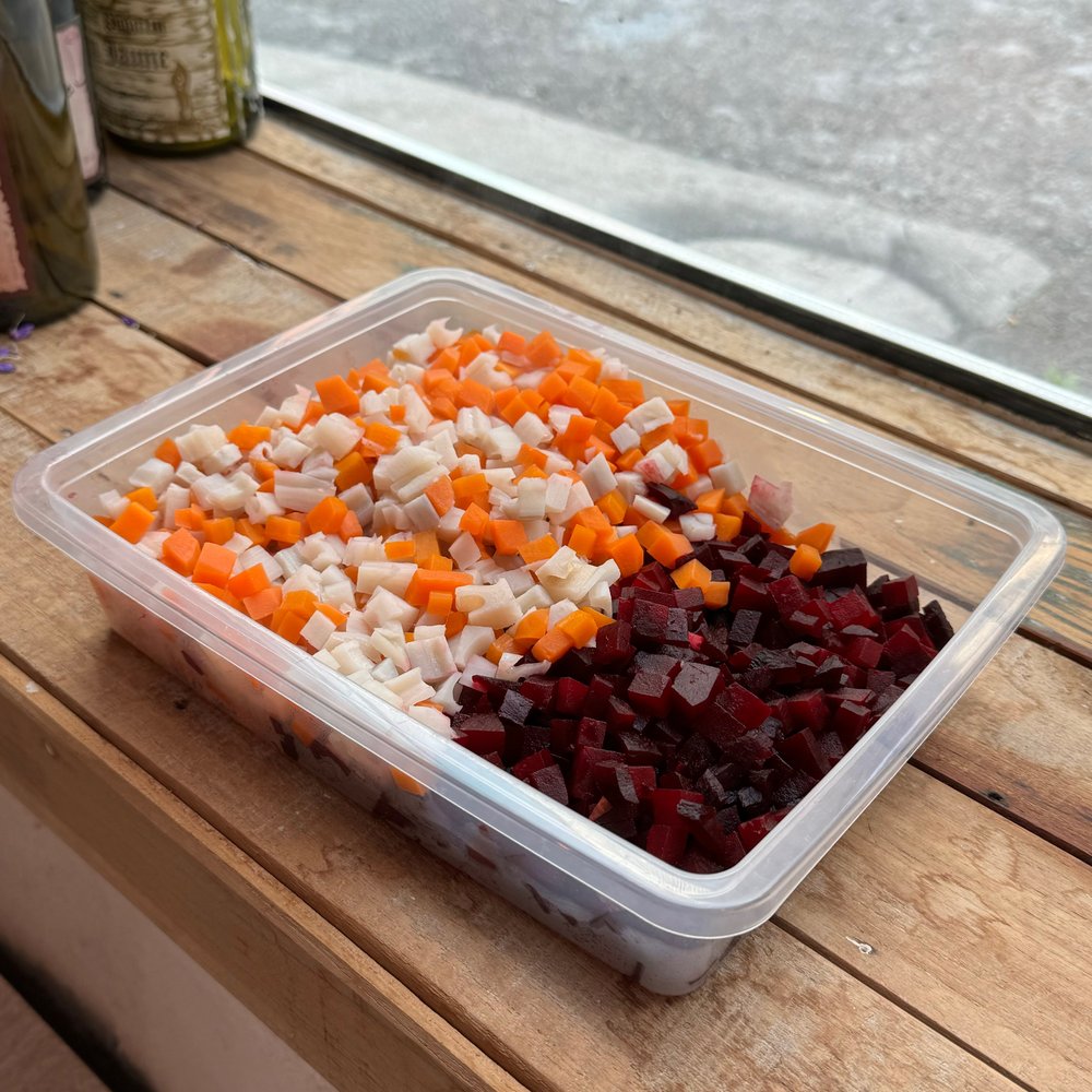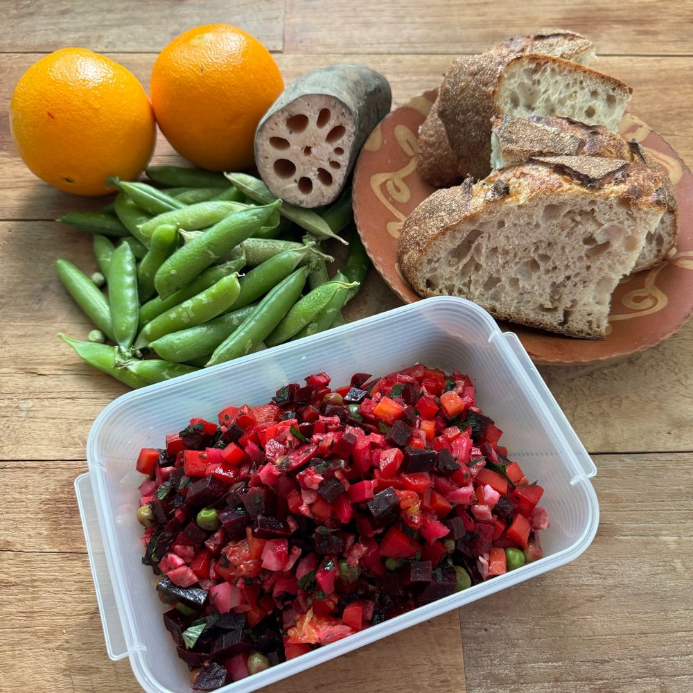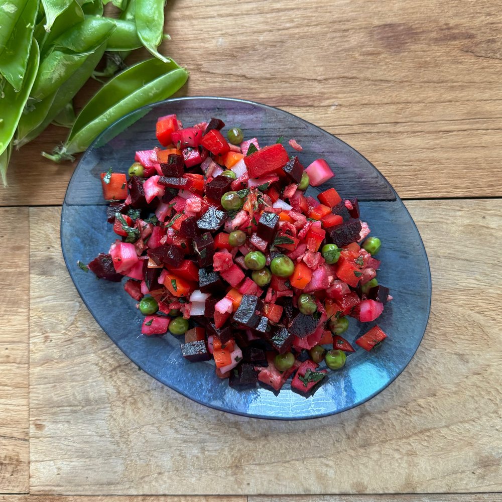 채소 살사에서 가장 중요한 채소는 바로 '비트'예요. 말랑한 듯 착 감기는 식감이 좋고 은은한 단맛이 일품이죠. 비트를 종이 호일에 싸서 200도로 예열한 오븐에서 50분 정도 구워 냉장고에 보관해 두면 10일은 거뜬하니 꼭 활용해 보세요. 채소 살사뿐 아니라 미소시루에 넣어도 붉은빛이 미소 시루에 퍼지며 아름답고 겉절이 양념으로 버무려도 맛있답니다. 솥밥에 넣어도 예쁘고요. 콩국수에 손가락 한 개 정도의 구운 비트를 넣고 갈아주면 아름다운 분홍색의 콩국수를 드실 수 있어요. 구운 비트와 짭짤이 토마토, 오렌지, 민트잎을 듬뿍 넣고 올리브 오일과 소금, 후추, 레몬즙으로 버무린 샐러드도 맛이 좋답니다!