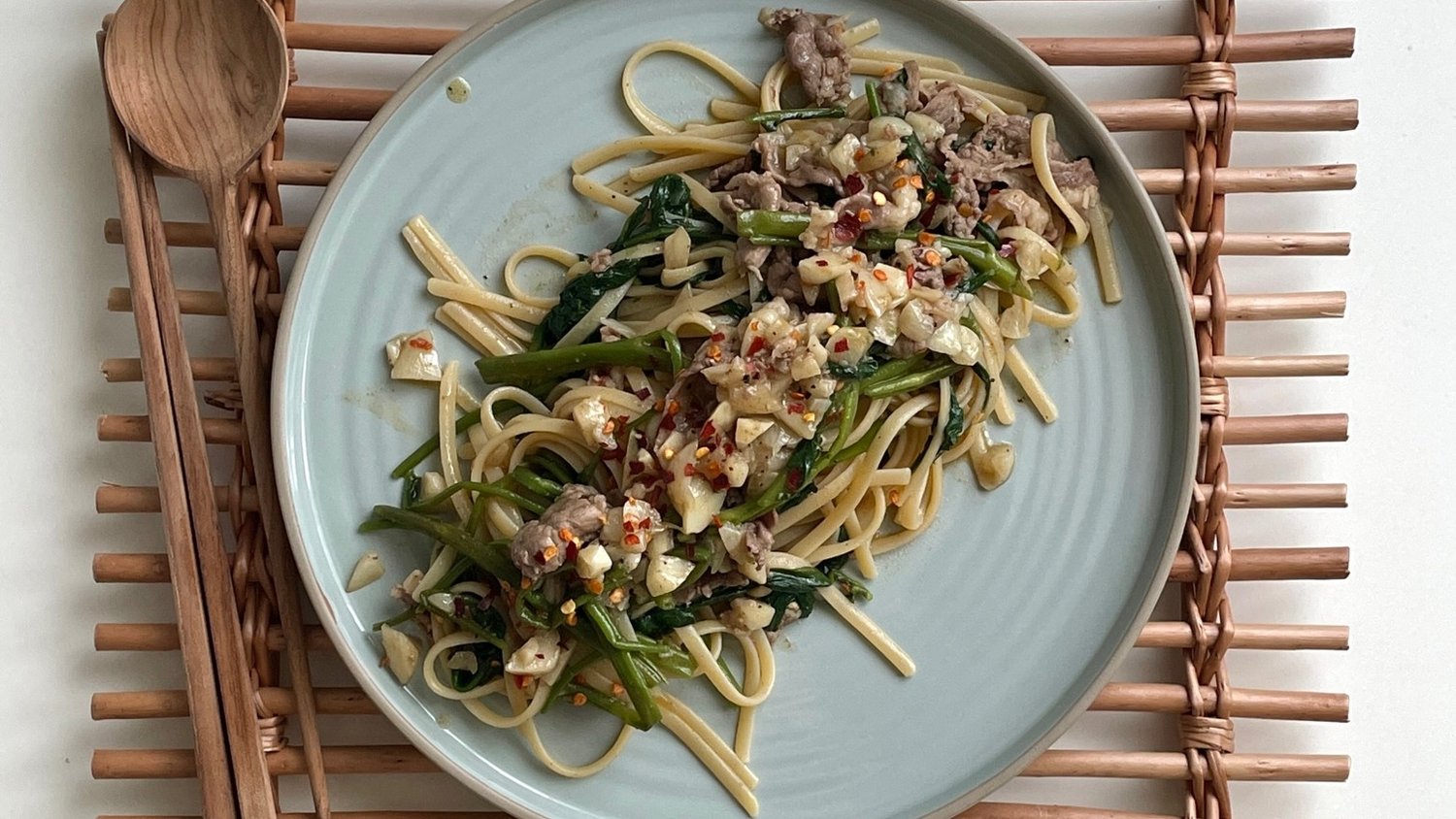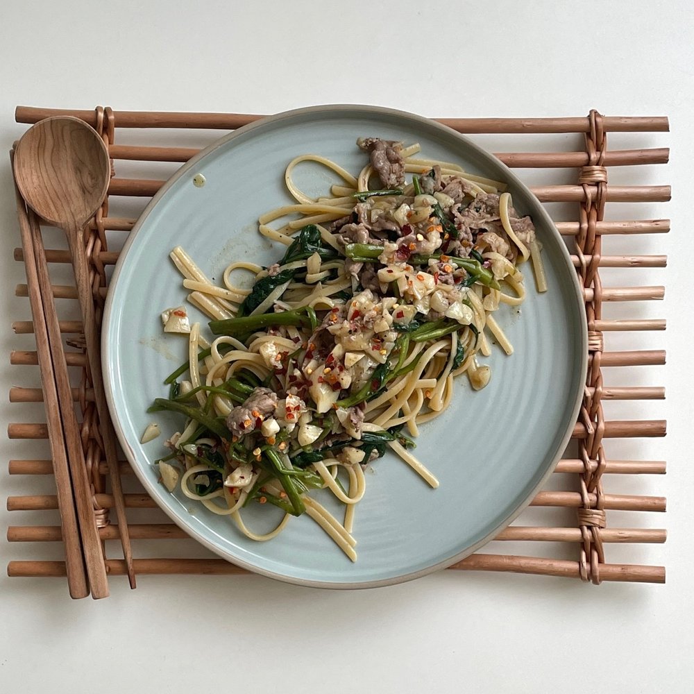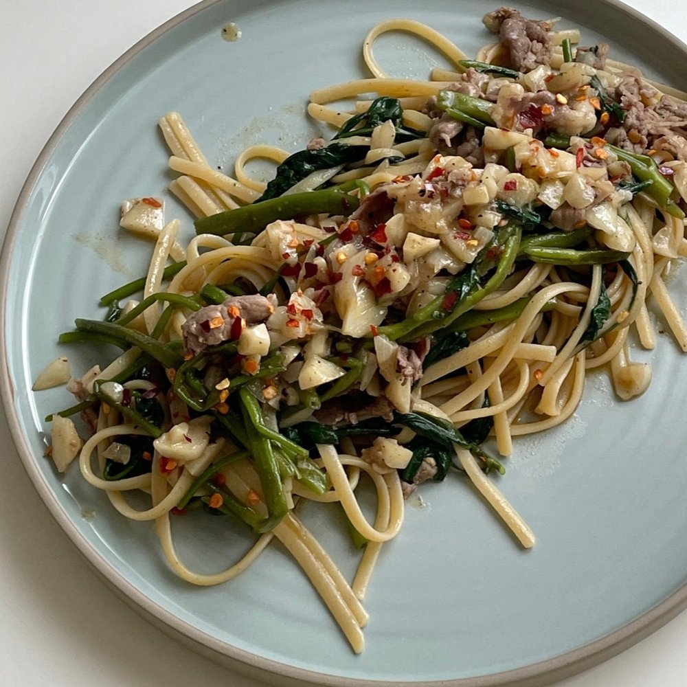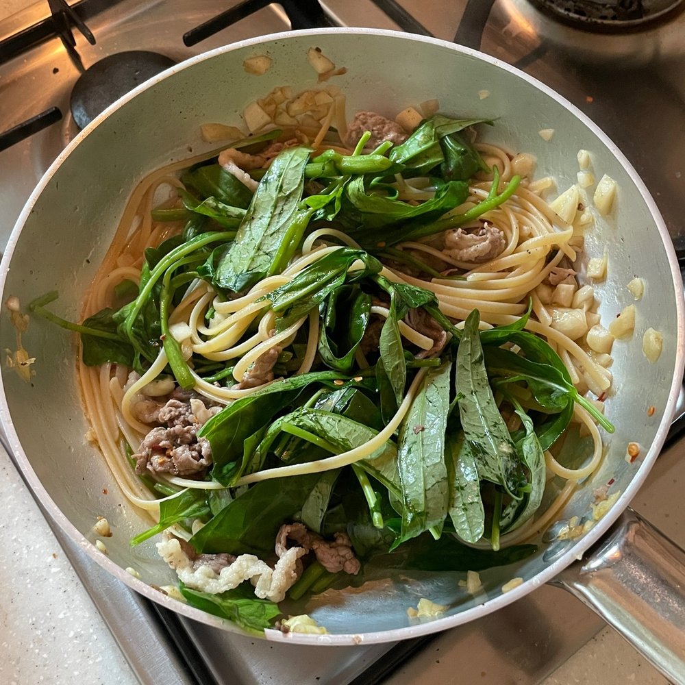 마늘향이 올라오면 공심채 두꺼운 줄기 부분과 차돌양지를 넣고 중불로 올려 가볍게 볶다 파스타 면과 면수 한 국자를 넣어 불을 중강 불로 올려줍니다.