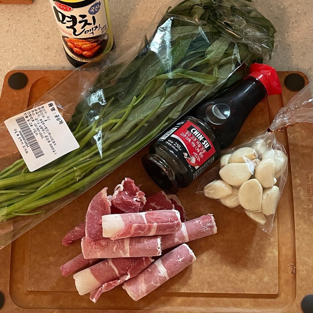 이때 공심채 잎 부분을 추가하고 [친수] 고추마늘간장 1스푼, 액젓 1/2스푼을 넣고 간을 해주세요.