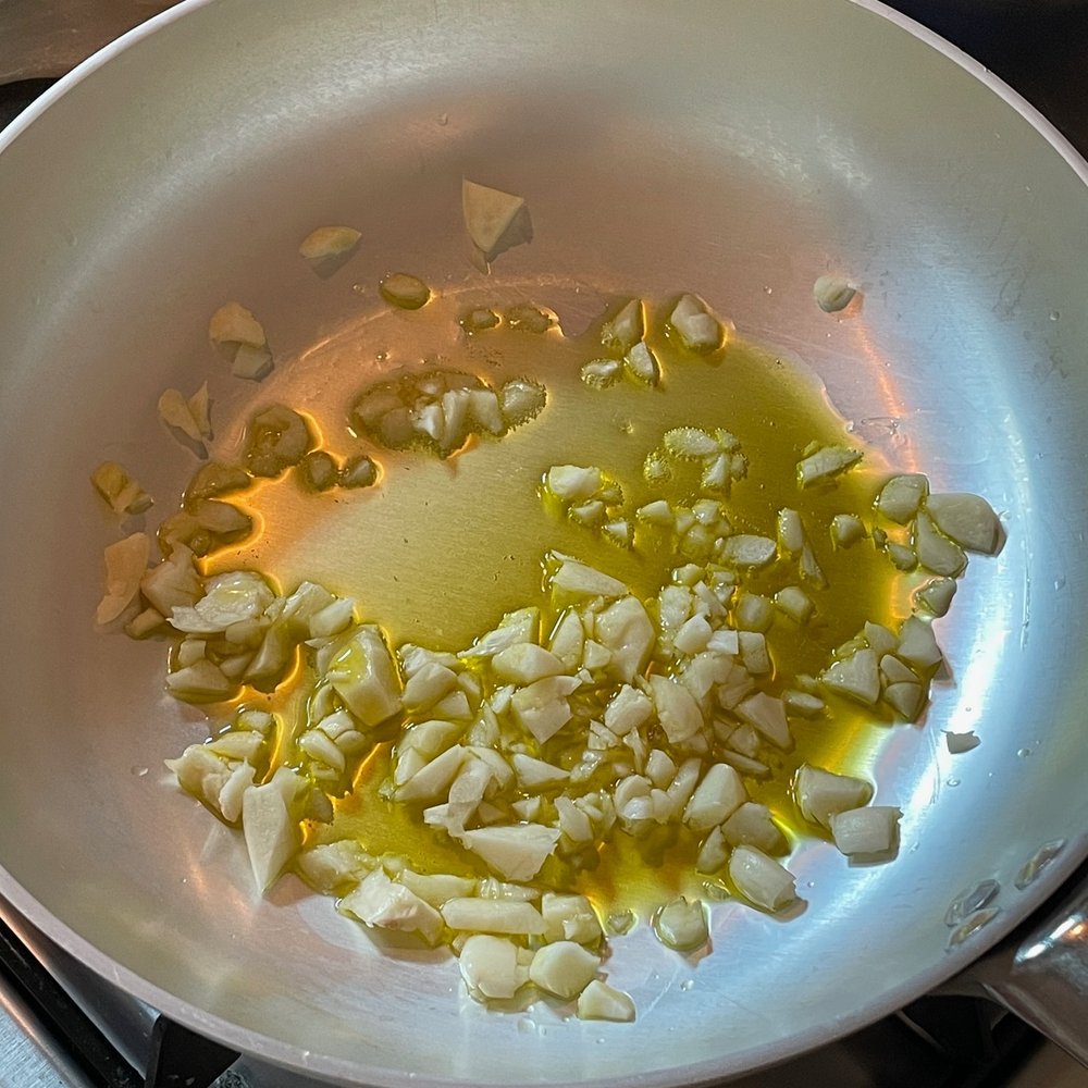 평소보다 조금 크게 다져 올리브오일 두르고 약불에 볶아줍니다.