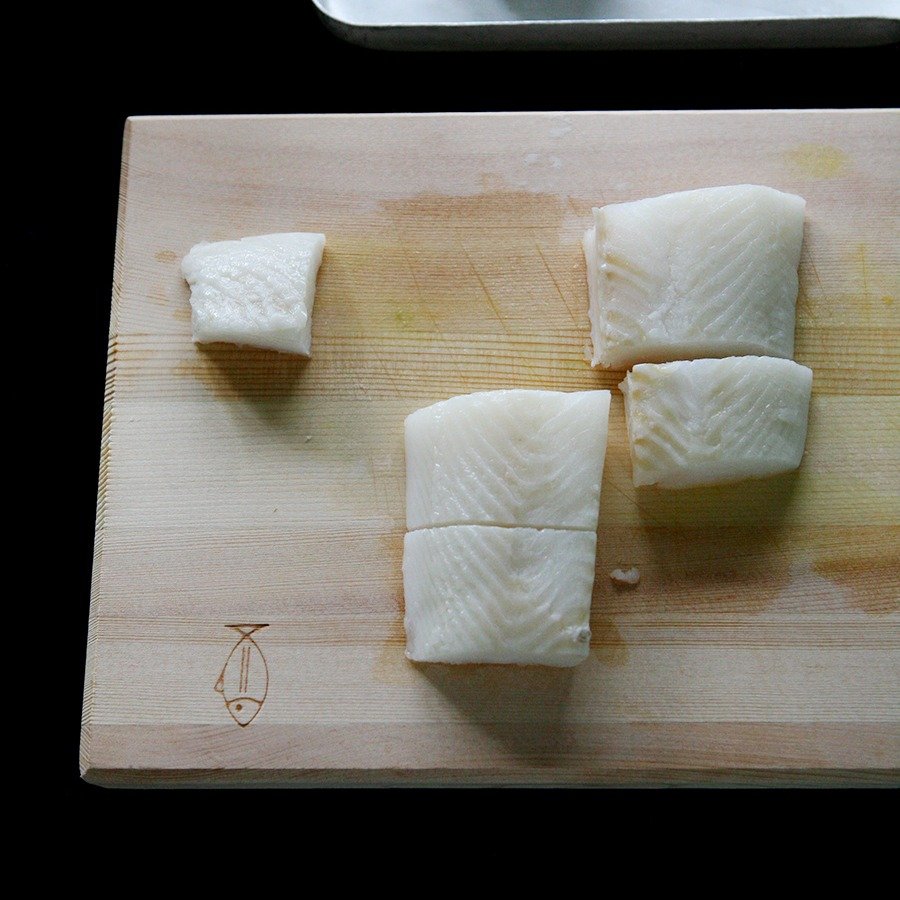 1. 냉동 가자미는 해동이 중요합니다. 실온에 서서히 녹여 준비하고 물기를 닦아주세요. 따로 세척은 필요하지 않습니다. 해동이 된 가자미는 사진처럼 썰어두고, 감자는 카레 재료처럼 나박하게 썰어 준비합니다.