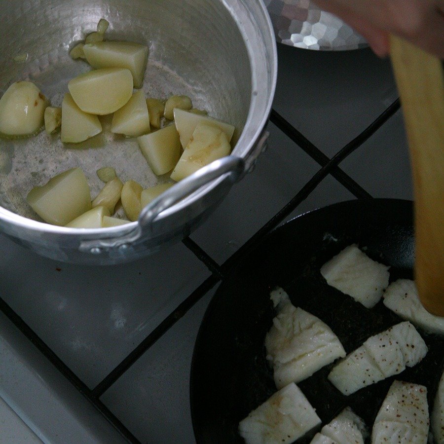 4. 감자가 익었으면 프라이팬에 익힌 가자미를 냄비로 옮깁니다.