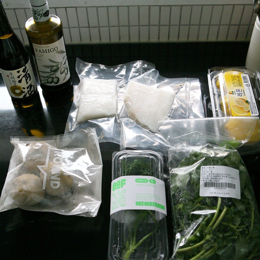 가자미 스테이크 200~250g (가족이 먹기에는 두 팩이 적당합니다), 감자 200g (작은 감자 두 알), 우리 청주 100ml, 비름나물 30g, 소금, 후추, 레몬 반 개, 딜 한 줄기, 올리브 오일 20ml