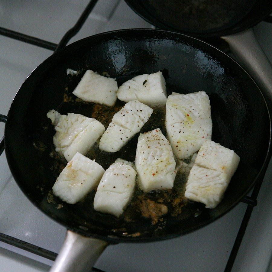 2. 프라이팬에 올리브 오일을 뿌리고 가자미를 구워요. 양면을 노릇노릇하게 익히며 후추를 뿌리고 소금간을 합니다.