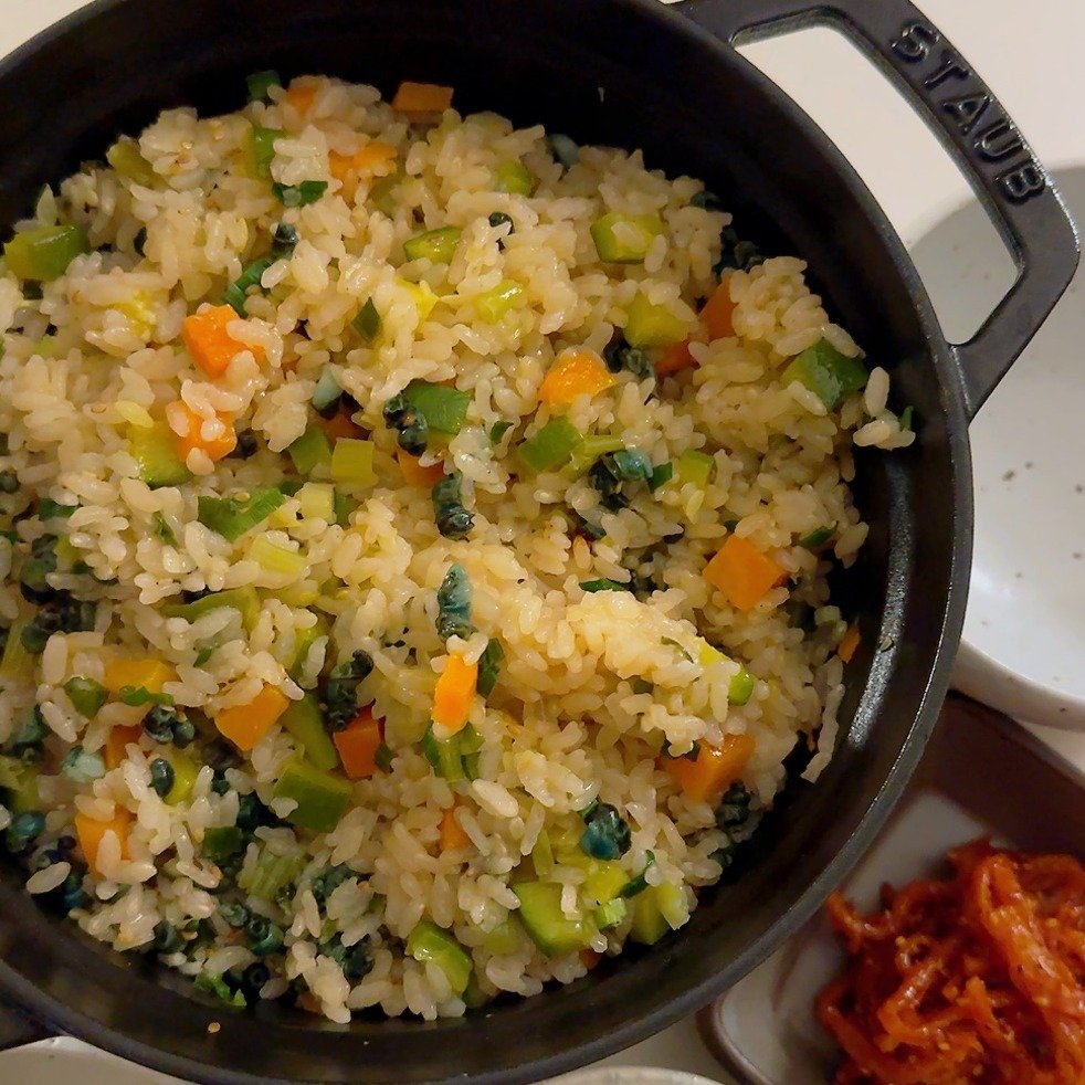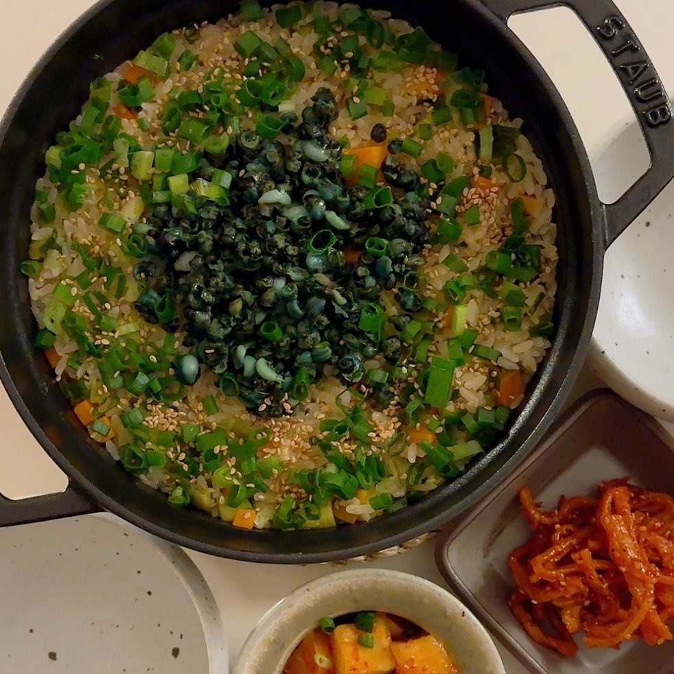 솥밥 육수를 된장 육수로 지었더니 된장의 구수함과 다슬기의 고소한 맛이 잘 어우러지는 한 끼 밥상이었습니다. 김치나 깍두기와도 잘 어울렸고, 김과 함께 싸 먹어도 맛있을 거 같아요 =)