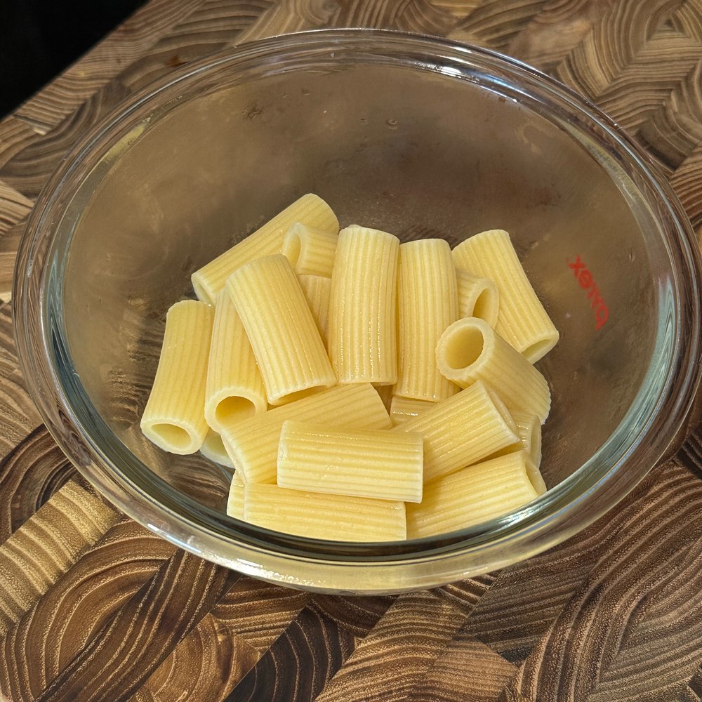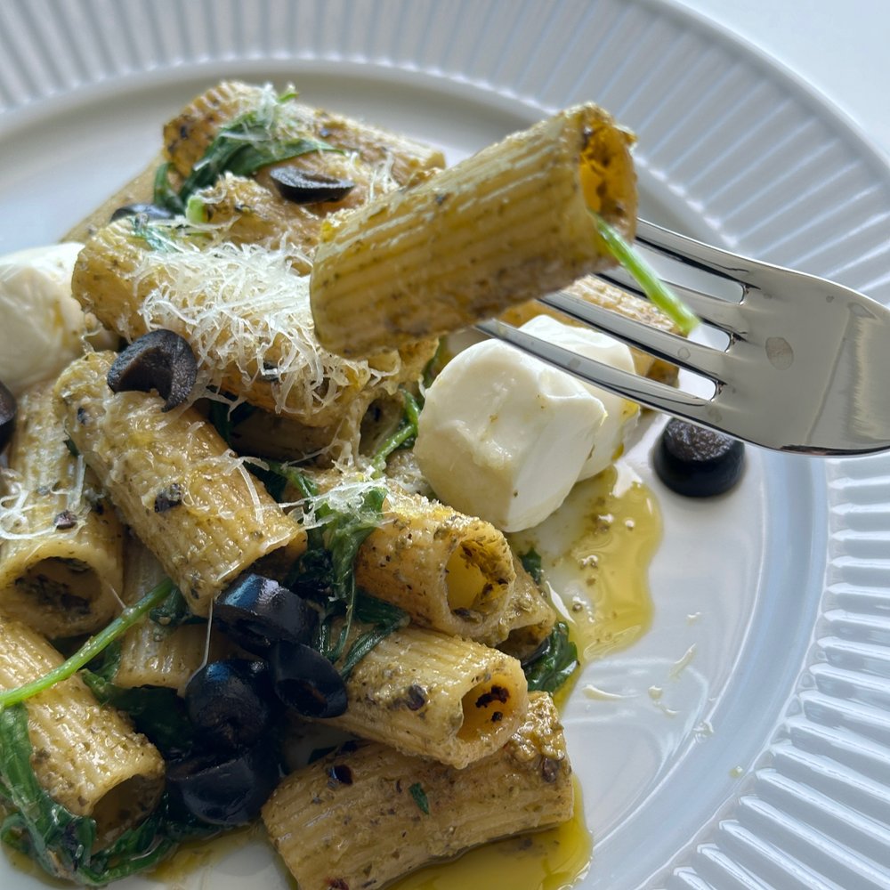 보글거리는 냄비에 양껏 리가토니를 넣고 여유롭게 집안일을 하다 보면 탱탱하게 면이 익어요. 익은 정도를 보려고 한두 개 주워 먹는데 그 자체로 맛있답니다. 올리브유를 충분히 두른 팬에 레드페퍼를 취향껏 넣고 면과 바질 페스토를 후루룩 섞어줍니다.