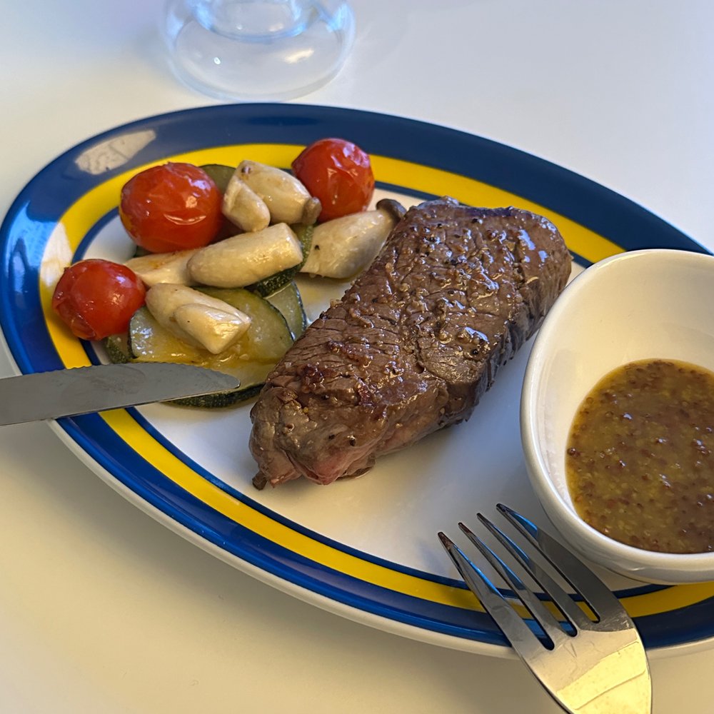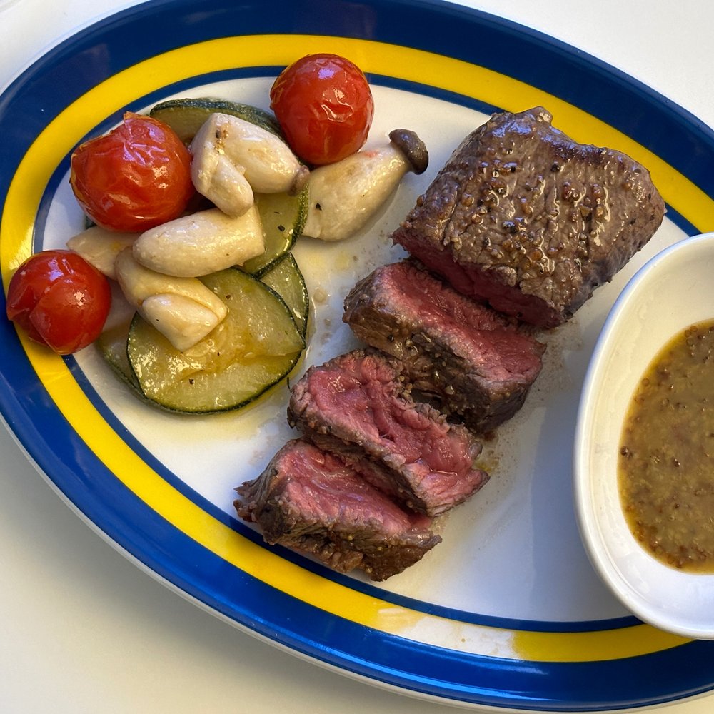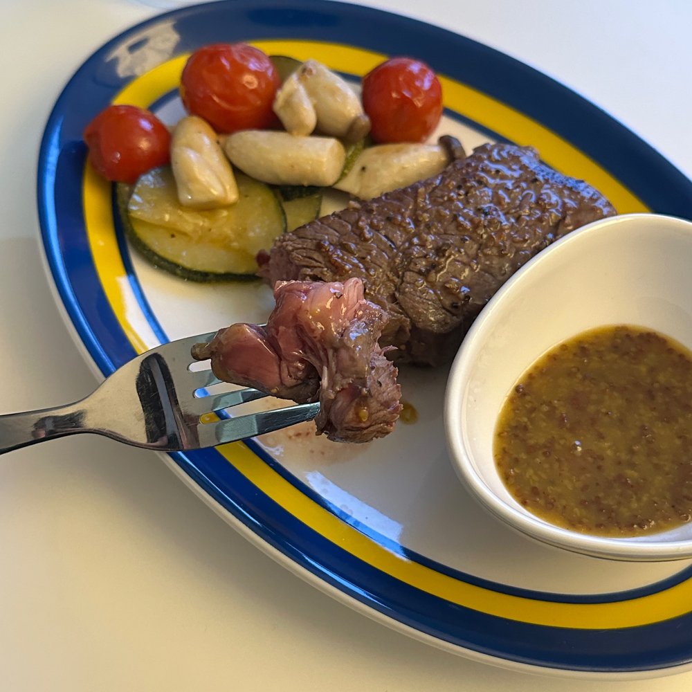 고기는 미리 핏물을 제거하고 시즈닝을 솔솔 뿌려서 밑간 해서 대기! 팬에 올리브유를 두르고 가니시를 먼저 구워줍니다. 방울토마토와 새송이버섯, 쥬키니의 조합은 삼삼하면서도 고기의 풍미를 확 올려줘요. 새로운 팬에 스테이크를 넣고 앞뒤 양옆 원하는 굽기 정도에 따라 구워줍니다. 저는 레어로 구웠어요.