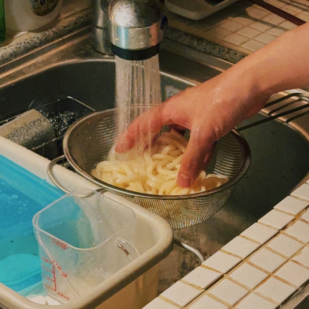5. 우동을 끓는 물에 2분 정도 삶고 차가운 물에 행궈둡니다(면수는 버리지 말아 주세요).