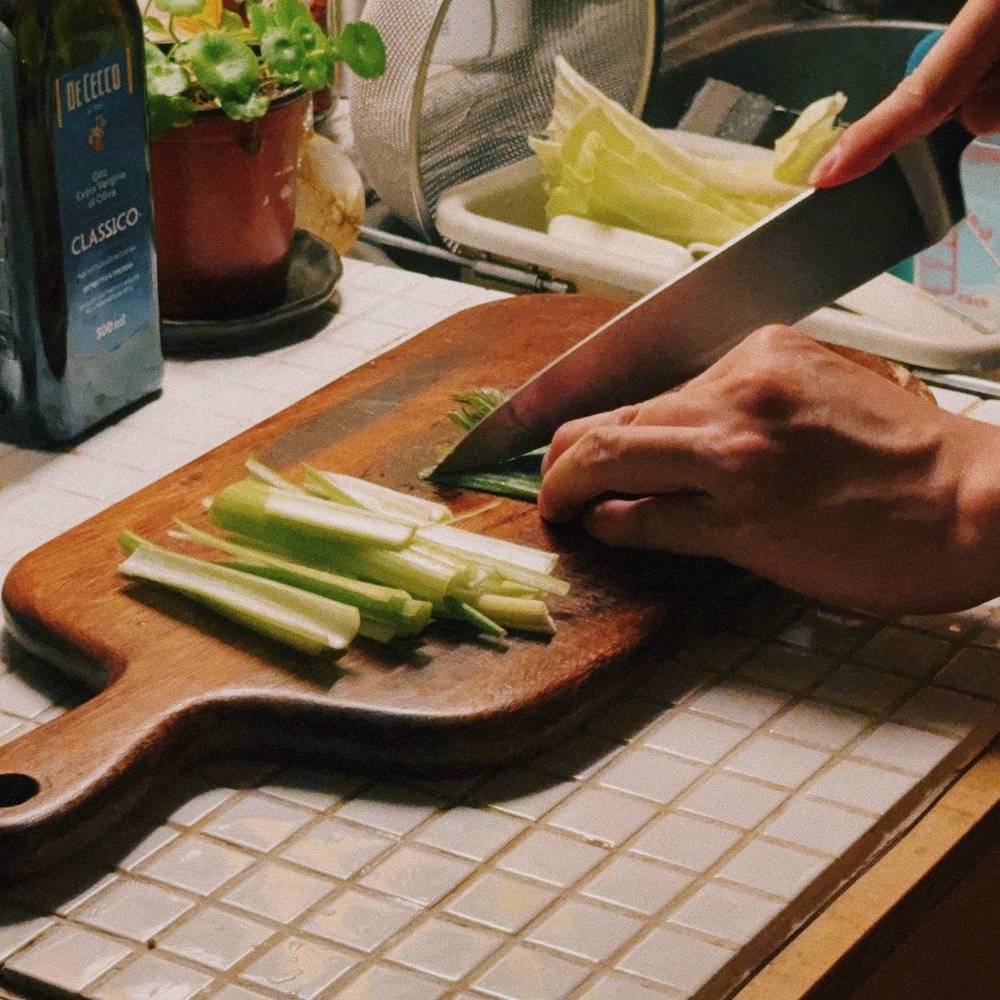 조리를 시작하기 전, 모든 야채는 결을 따라 미리 손질해 두는 게 좋습니다. 우동을 삶으면서 야채를 손질하기에는 면을 삶는 시간이 약 2분밖에 되지 않아서 찬물에 넣어둔 우동 면이 불어버릴 수도 있거든요!