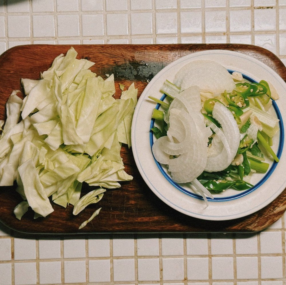 1. 양배추, 양파, 고추, 대파 등을 기호에 맞게 썰어서 준비합니다.