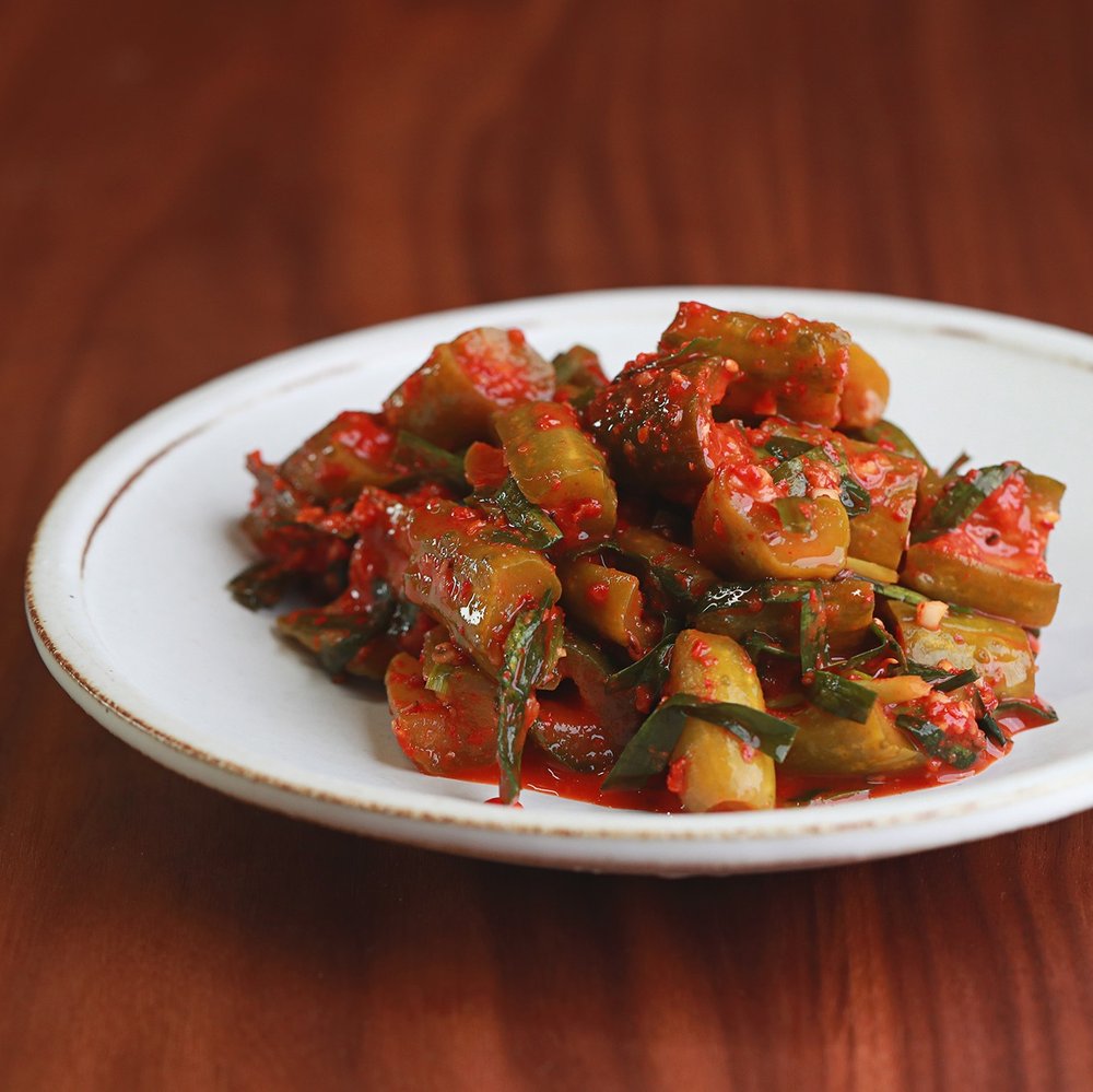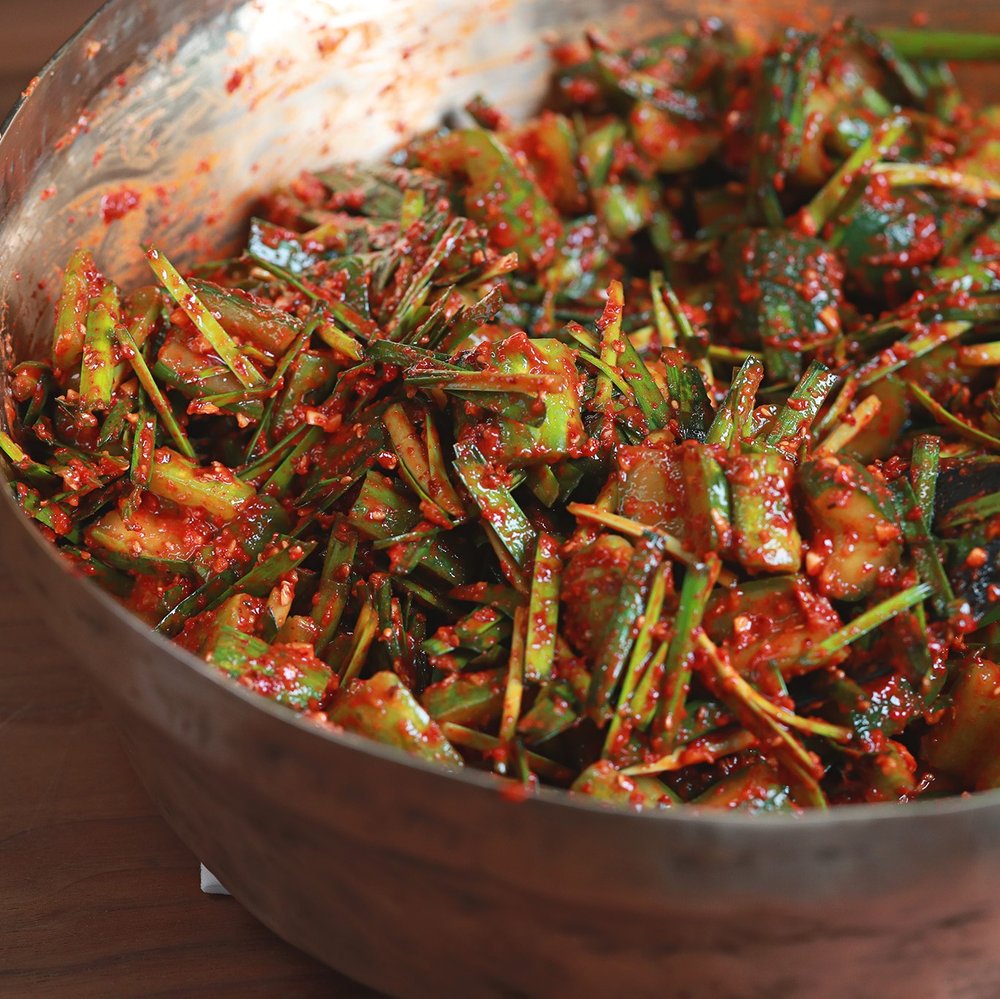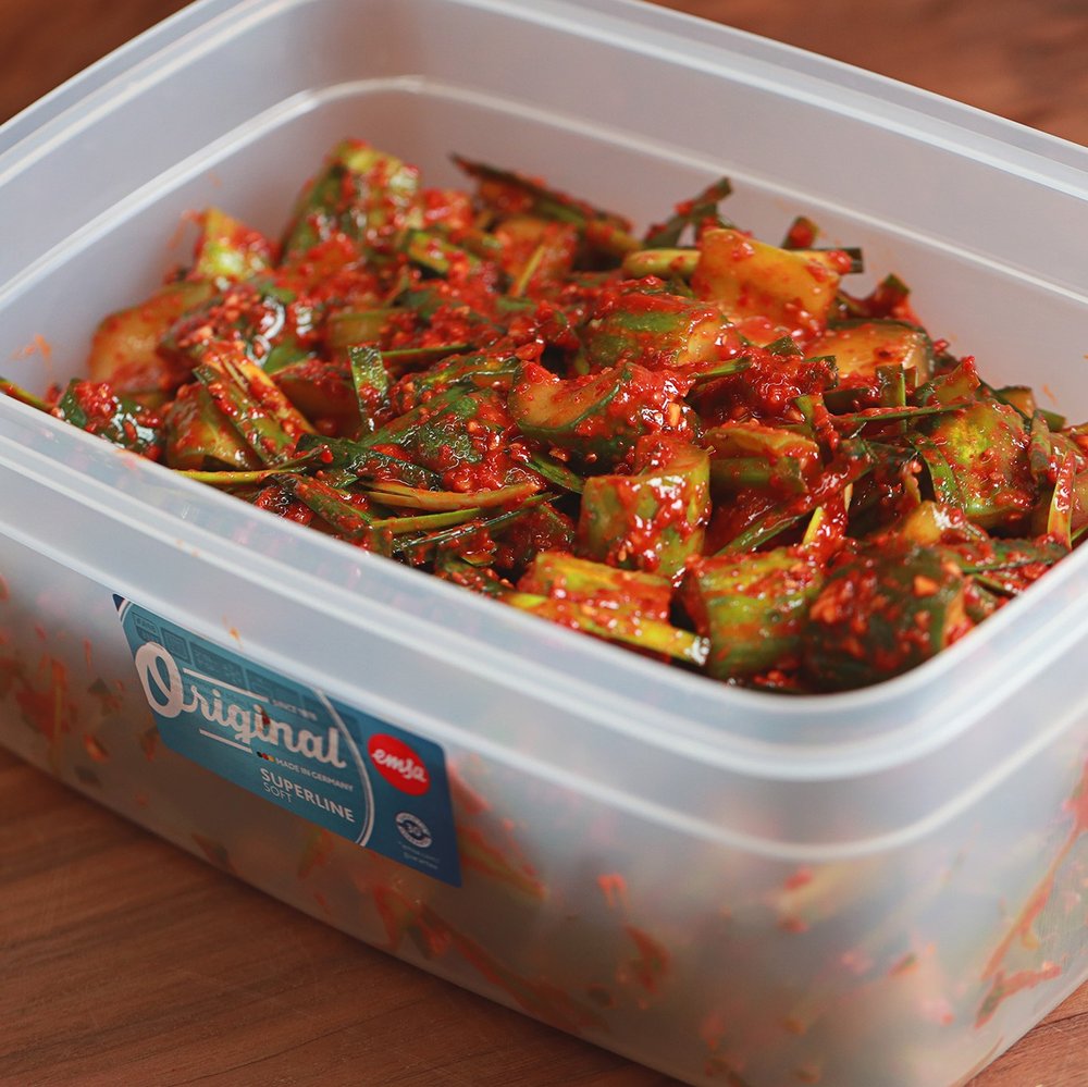 오이 10개 → 깨끗하게 씻어 뜨거운 물을 오이 겉에 뿌려준 다음 찬물에 바로 씻어 주세요. 반으로 갈라 씨 부분은 도려내고 깍두기 모양으로 썰어 소금 2T에 30분 뒤집어 가면서 절여 주세요 / 부추 200g → 3~4cm 사이즈로 잘라 주세요 / 양파 반 개 / 홍고추 6개 / 마늘 10알 → 믹서기에 갈지 말고 다져 넣으세요 / 생강 엄지손톱 크기 한 알 → 없으면 생략하셔도 됩니다 / 꽃게 액젓 3T → 꽃게 액젓이 없으면 까나리액젓 멸치액젓 사용 가능 합니다 / 새우젓 1T / 매실청 5T / 흰밥 2T / 고춧가루 5T / 통깨 조금