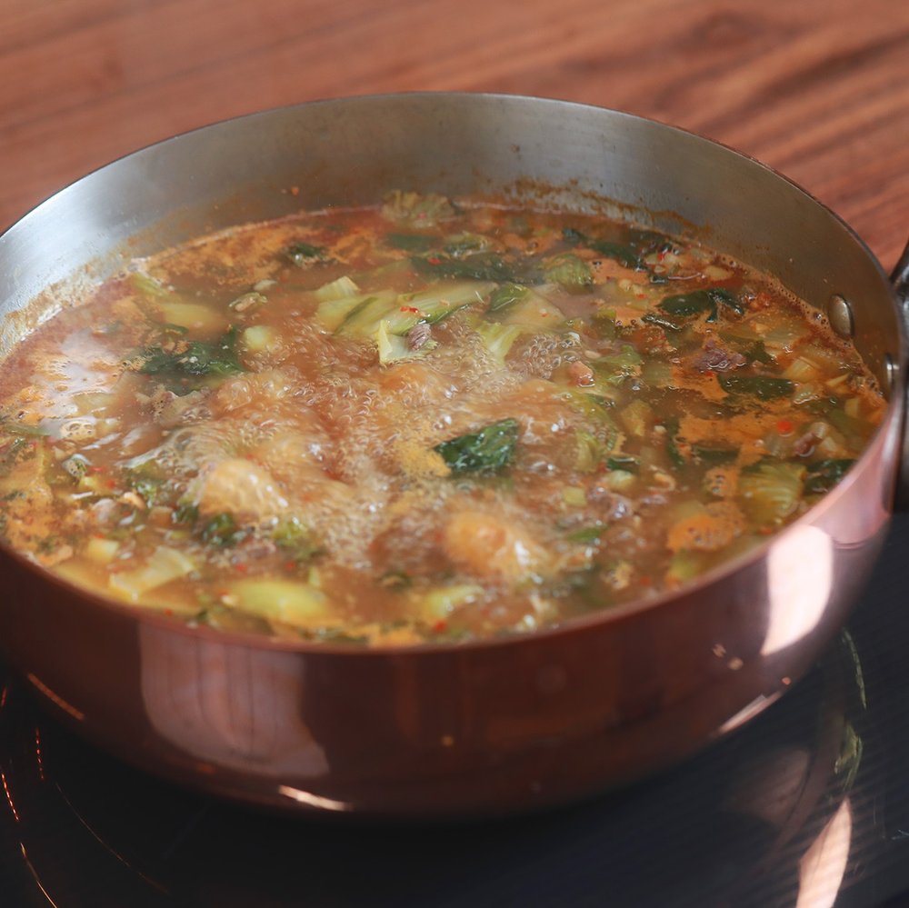 8, 수분이 없을 때까지 달달 볶다가 양념한 얼갈이를 넣고 육수 2리터 넣어 한 소금 끓여 주세요.