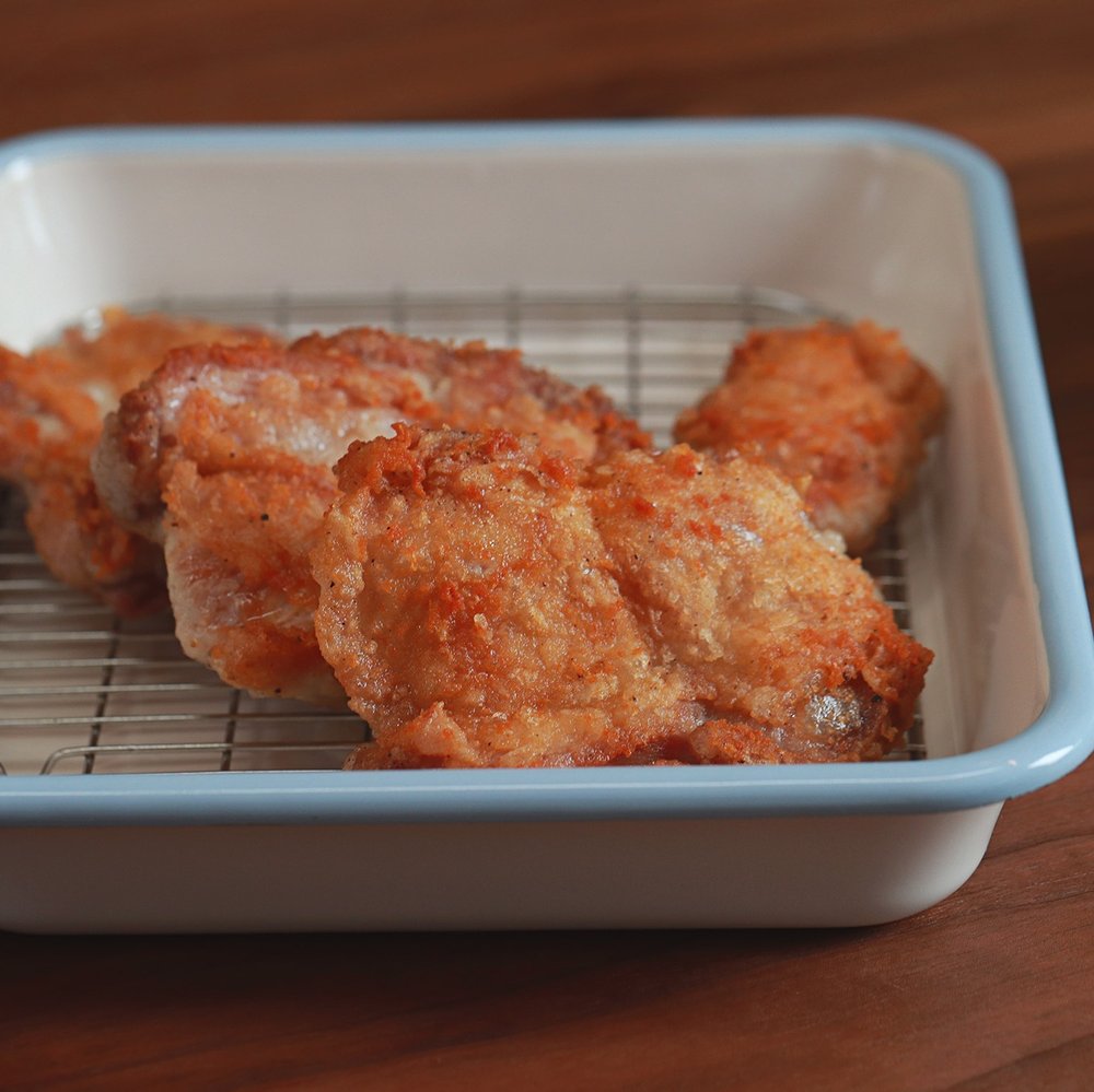 6, 기름에 튀긴 닭은 가위 또는 칼로 먹기 좋은 사이즈로 잘라 준다.