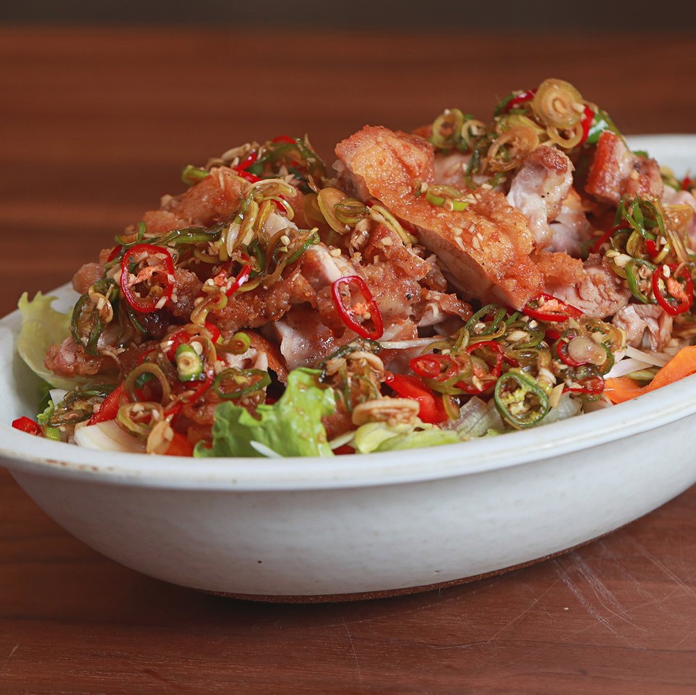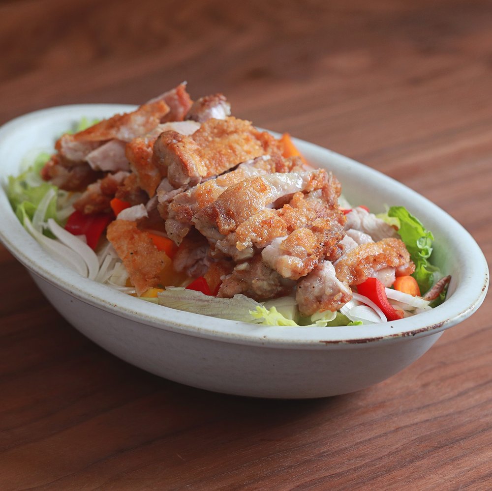 7, 양상추를 깔고 튀긴 닭을 올린 후에 준비한 소스를 뿌려 맛있게 드세요.