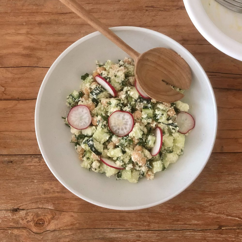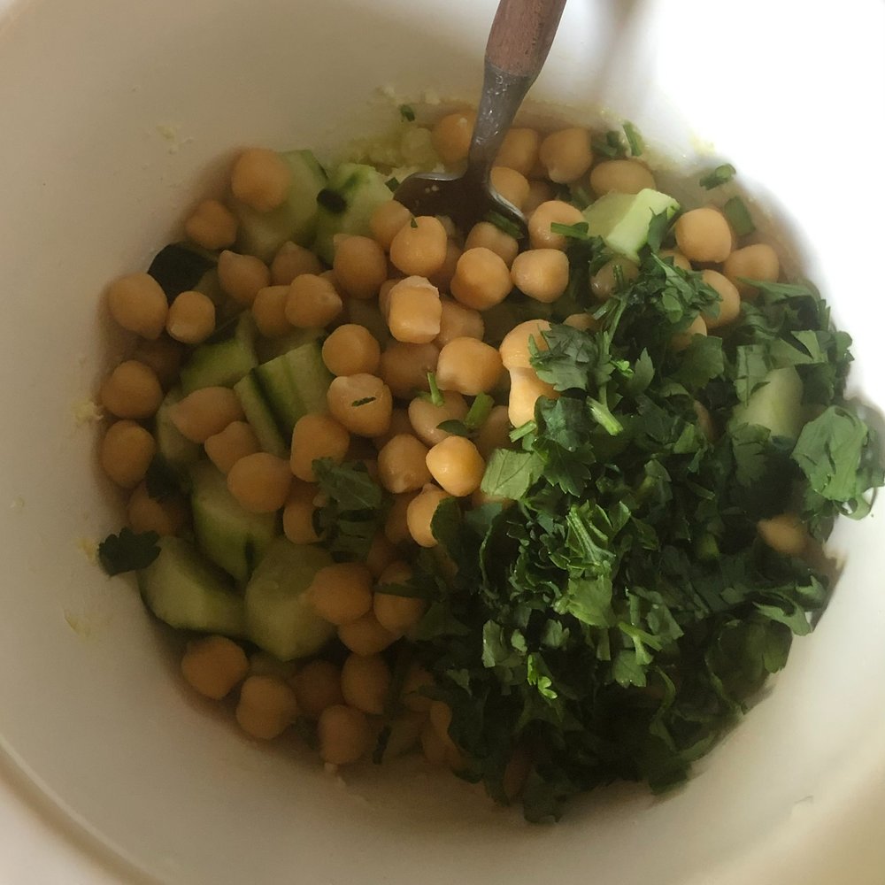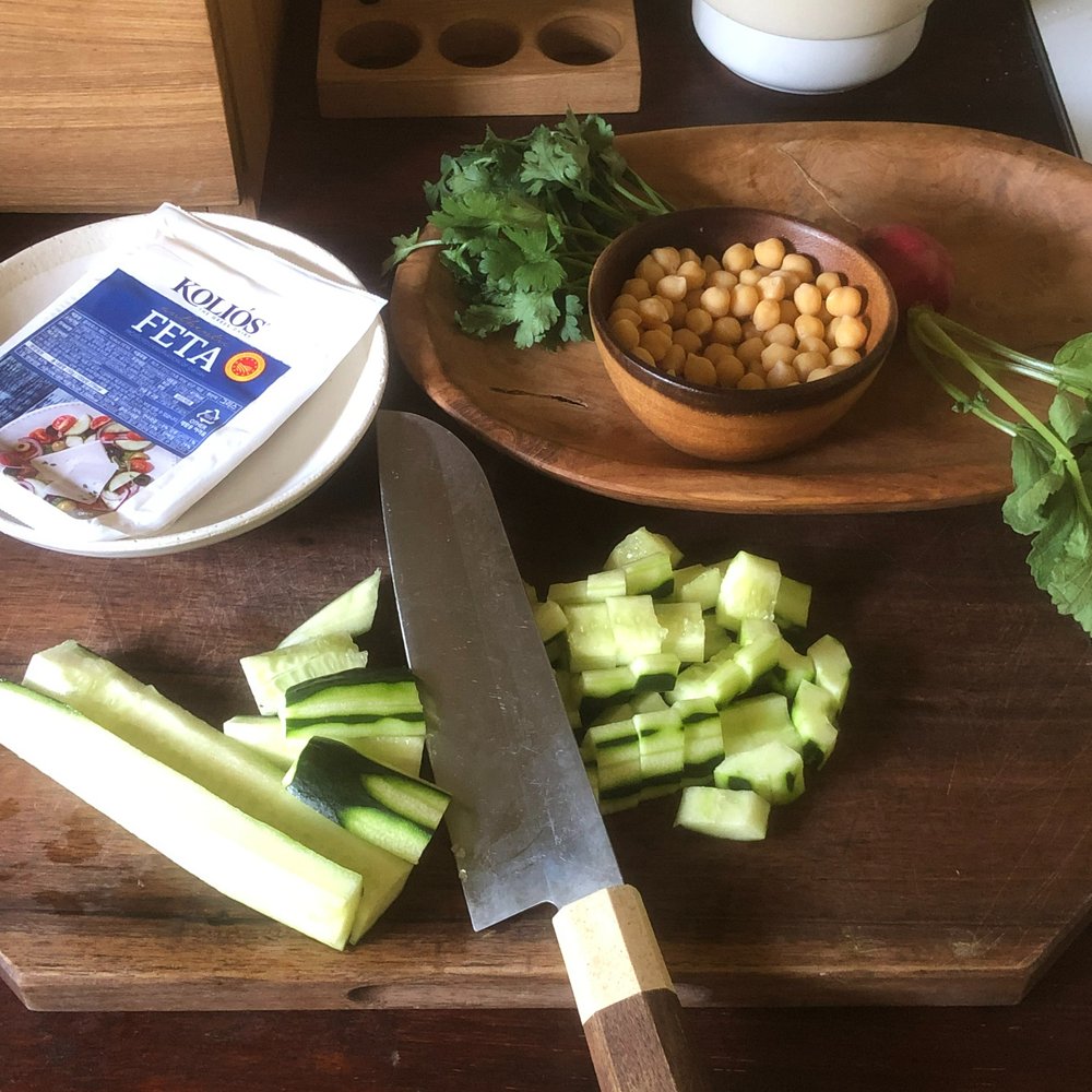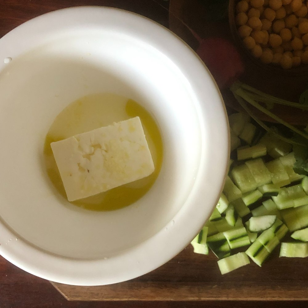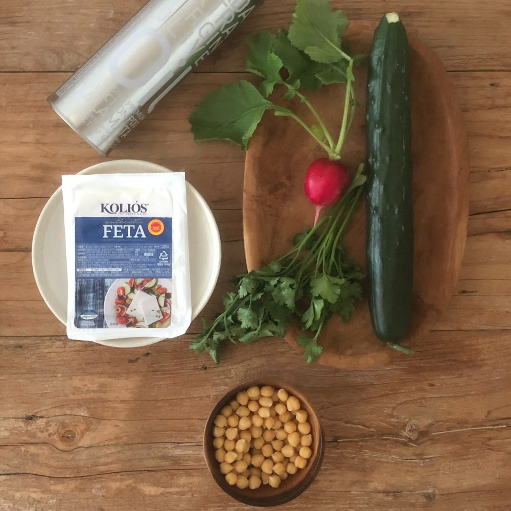 그릇에 페타치즈, 올리브 오일, 레몬 주스, 소금, 후추를 넣고 잘 섞어줍니다. 오이는 씨를 바르고 파슬리와 함께 먹기 좋게 썰어둡니다. 익힌 병아리콩과 모든 재료를 충분히 섞어 스푼으로 떠먹으면 좋아요. 또 이 메뉴에 크래커만 추가 한다면 간단한 와인 안주로도 응용할 수 있답니다.