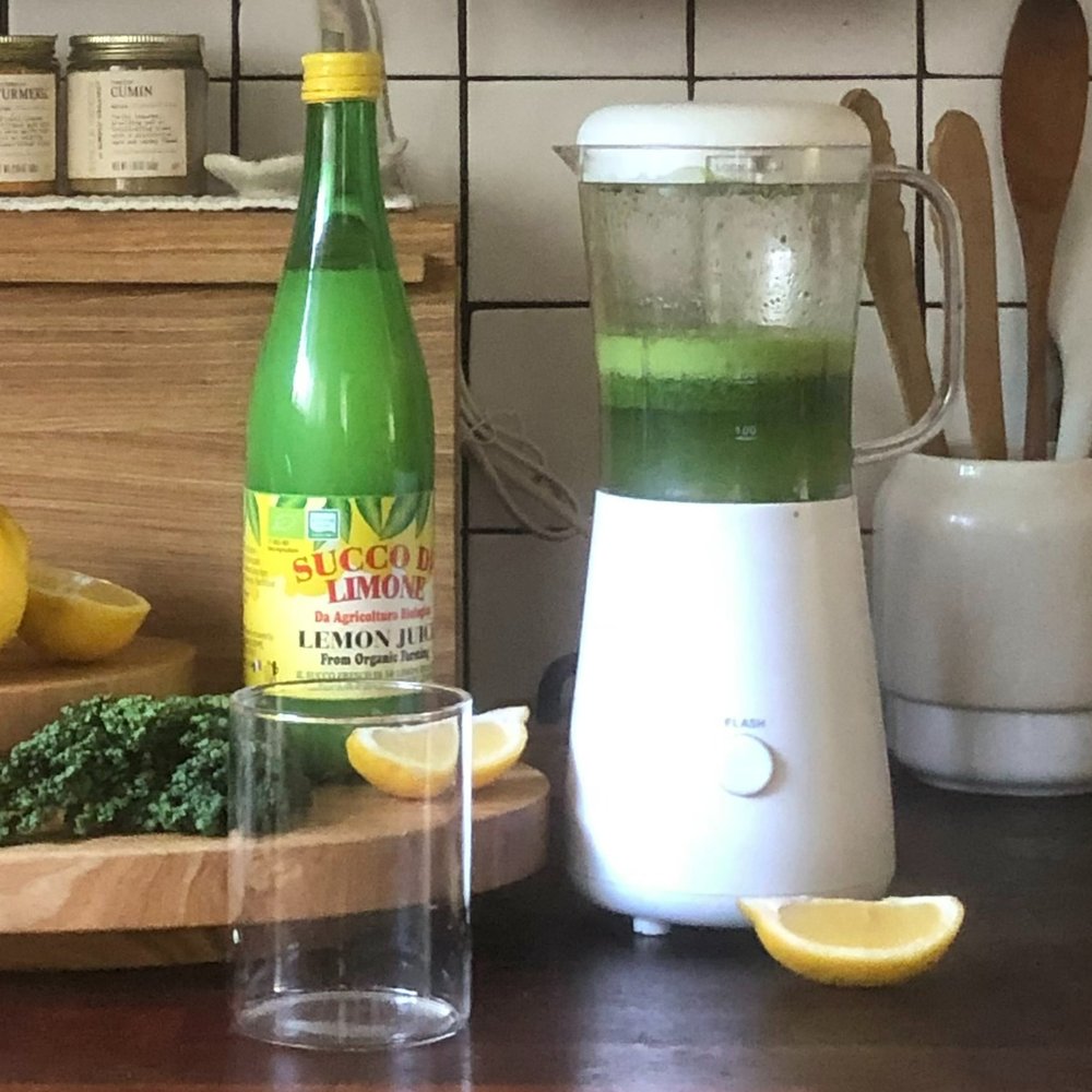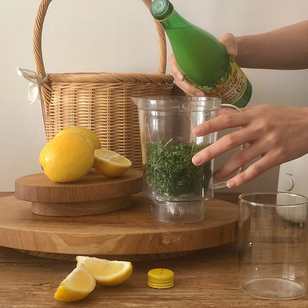 믹서기에 파슬리 반 줌(약 30g,) 레몬 반 개, 물 200ml를 넣고 갈아줍니다.