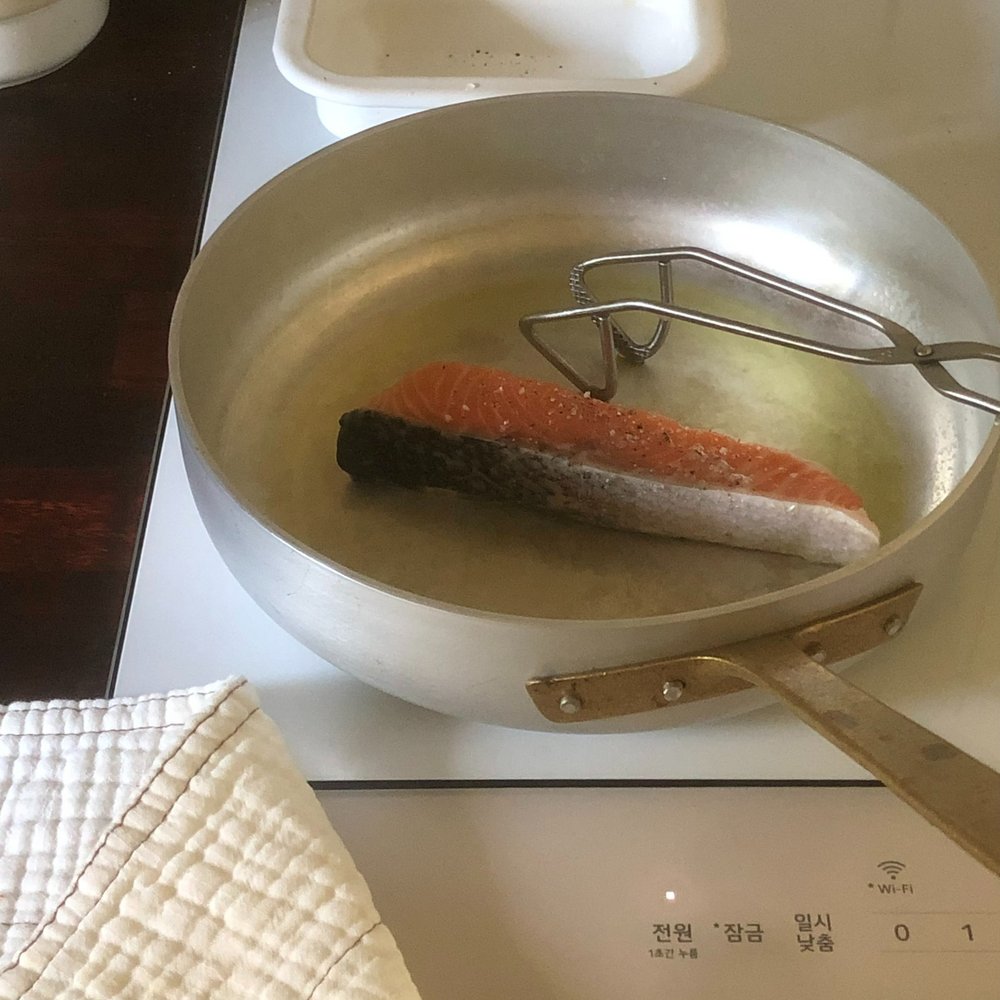 기름을 두른 프라이팬에 연어를 노릇하게 구워줍니다.
