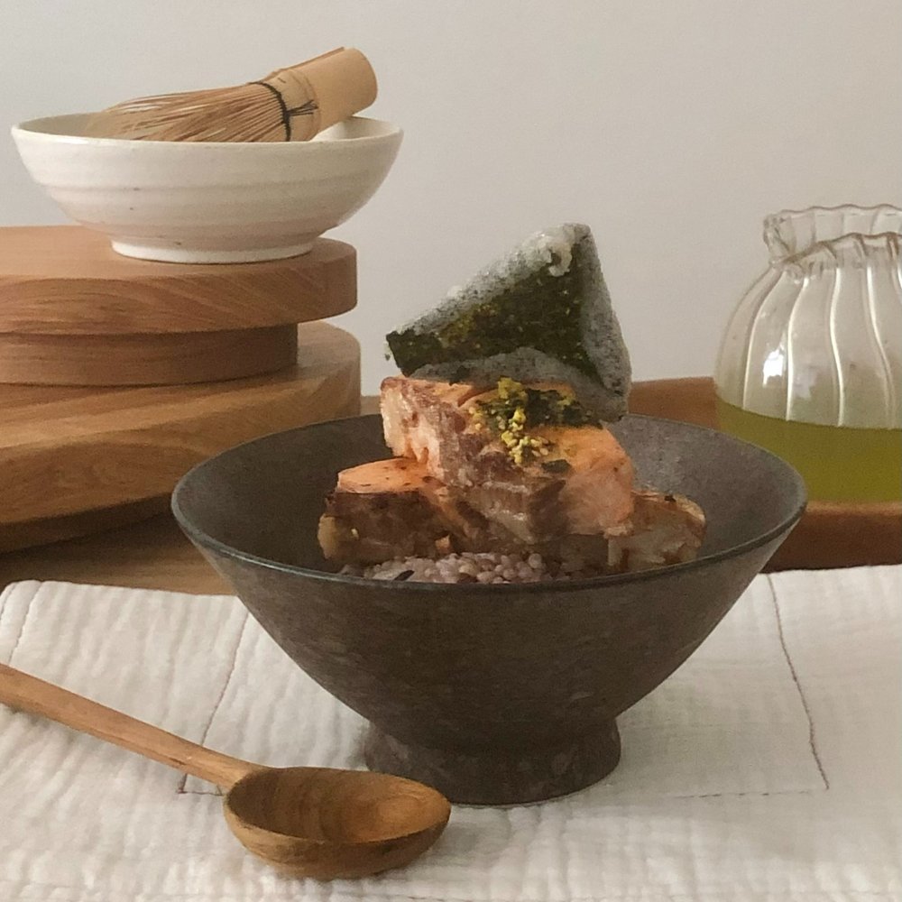 넉넉한 보울에 밥 반 공기를 넣고 구운 연어를 밥 위에 올려줘요.