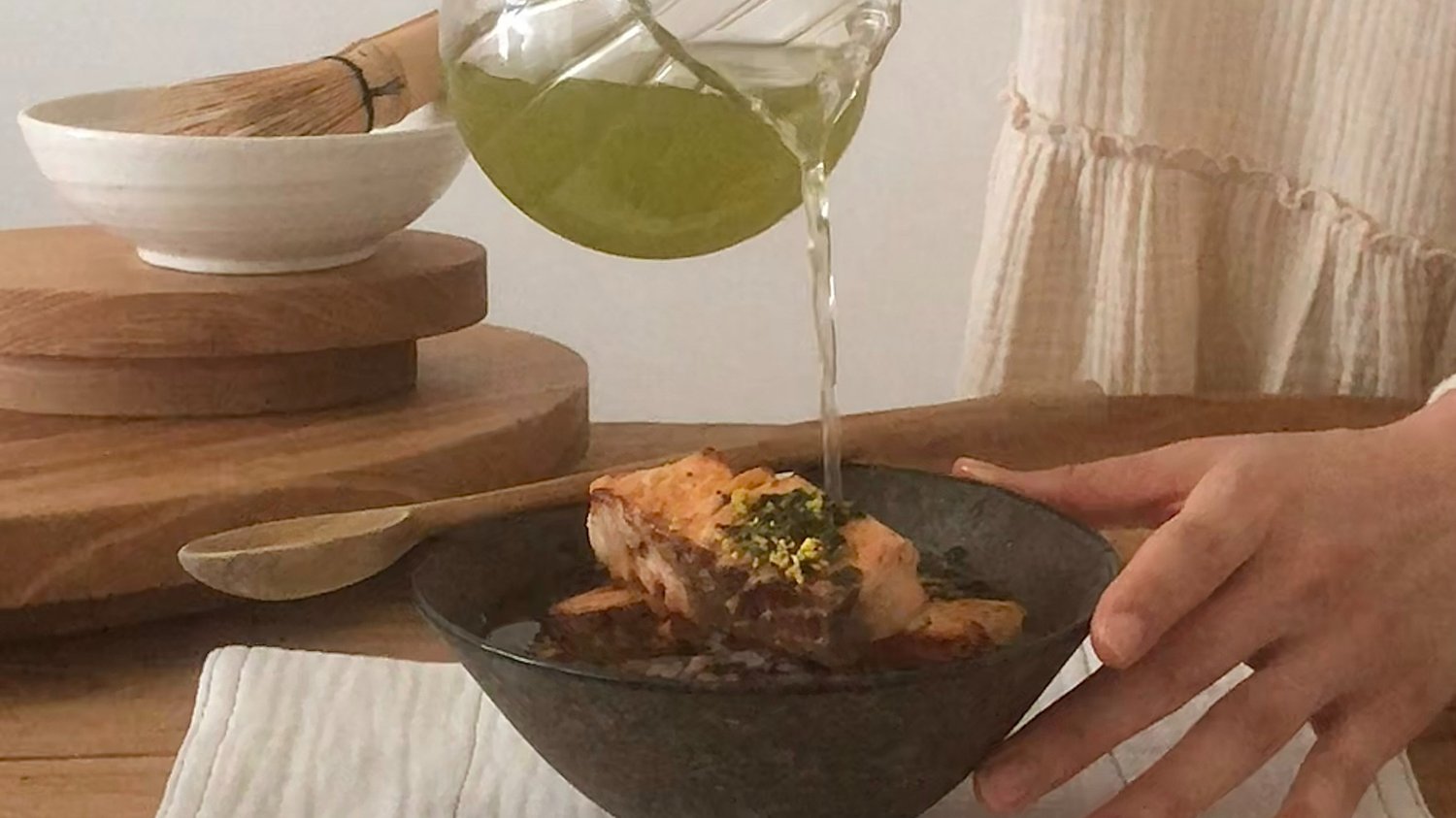 따뜻한 녹차를 밥과 연어가 있는 보울에 부어준 후