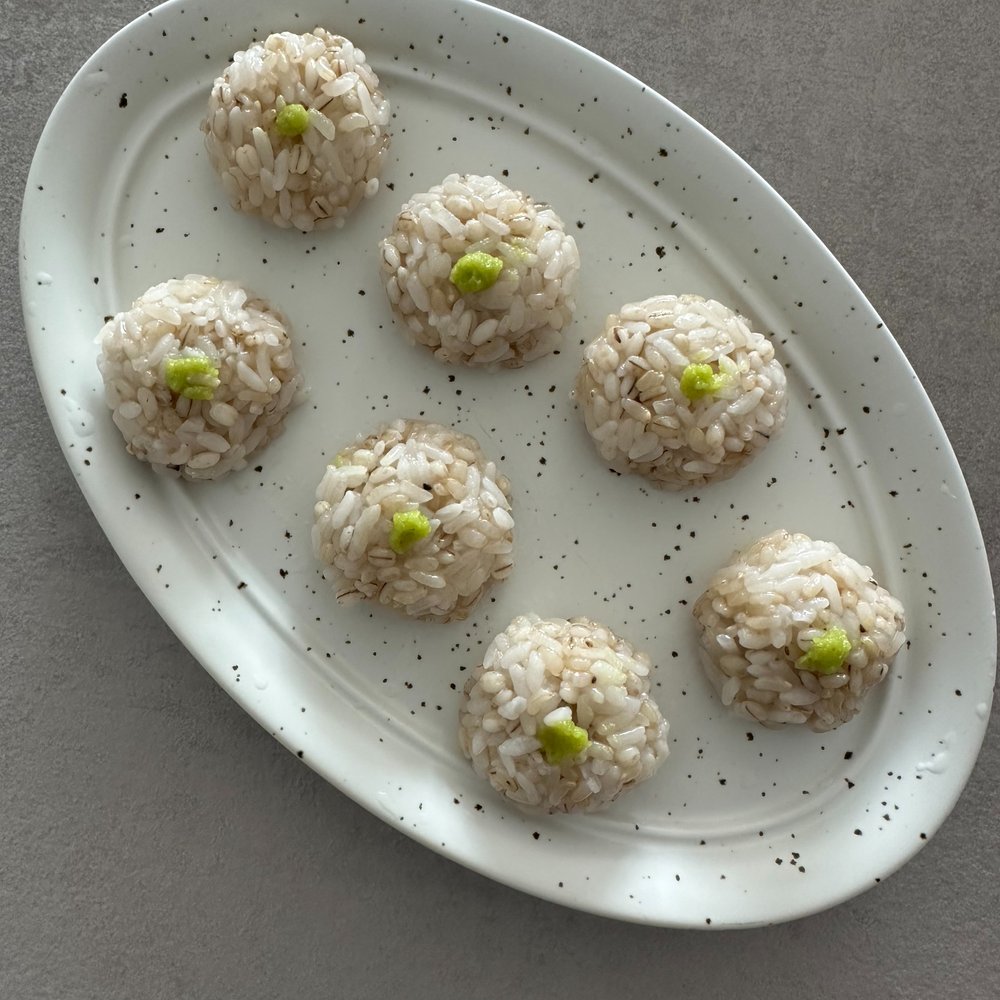 3. 밥은 한 입 크기로 동그랗게 뭉친 후, 와사비, 구운 가지 순으로 올린 후 데친 부추로 말아준다.