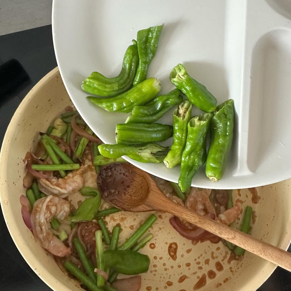 2. 1에 더하기 소스를 넣어 볶다, 새우, 꽈리고추를 넣어 마늘종이 살짝