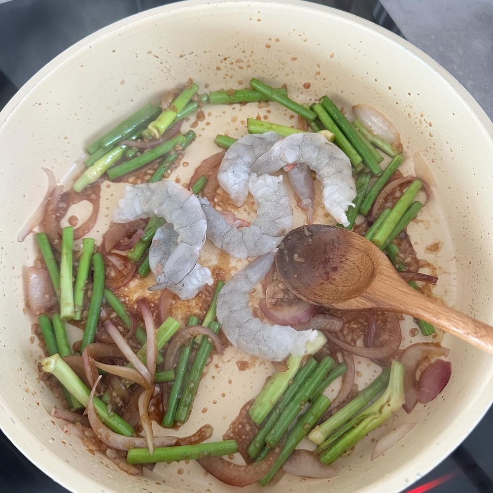아삭하게 볶은 마늘종과 쫄깃한 새우에