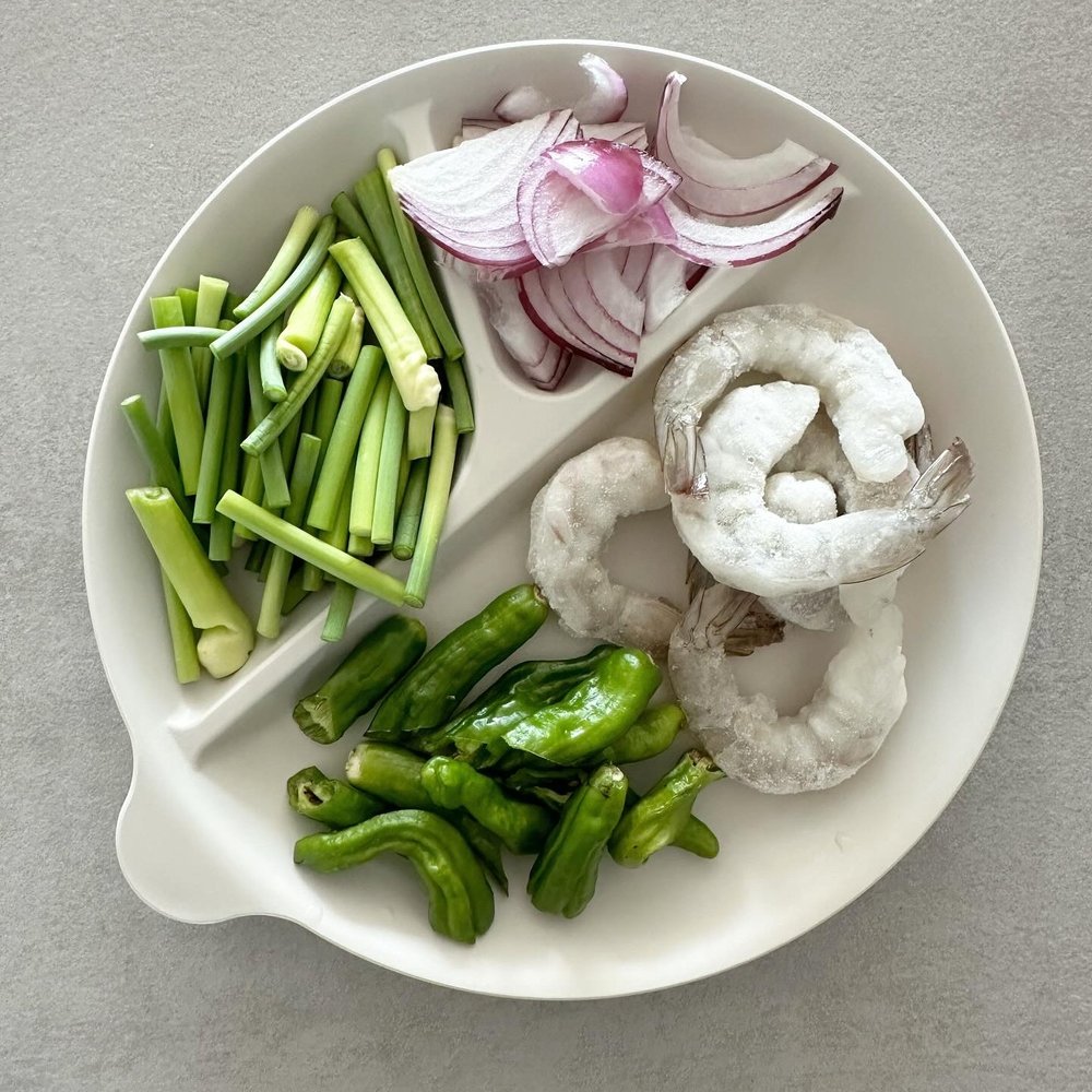 메인 재료: 마늘종 한 줌, 냉동새우 5~6개, 양파 1/4개
