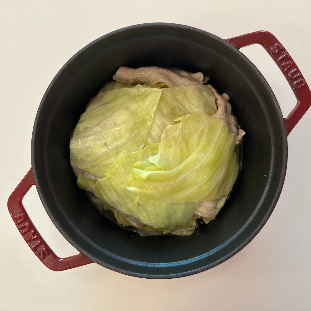 2. 냄비에 양배추, 대패삼겹살을 겹쳐가며 꽉 채워주세요.