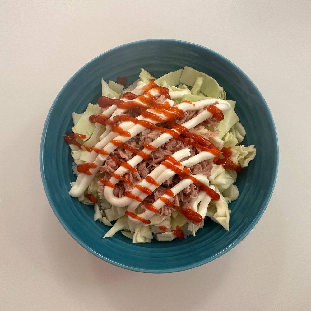 재료: 현미 햇반 1인분, 양배추 100g, 참치 1캔, 마요네즈 약간, 스리라차 소스 약간