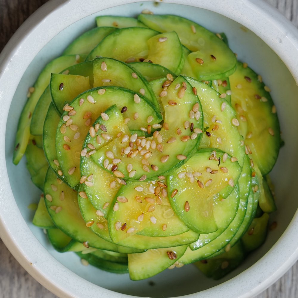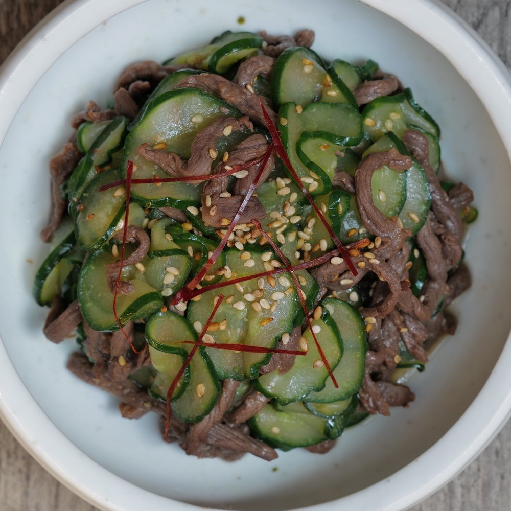 4. 볶아진 오이는 적당히 식으면 볶은 소고기와 섞고 통깨를 뿌려 완성한다.