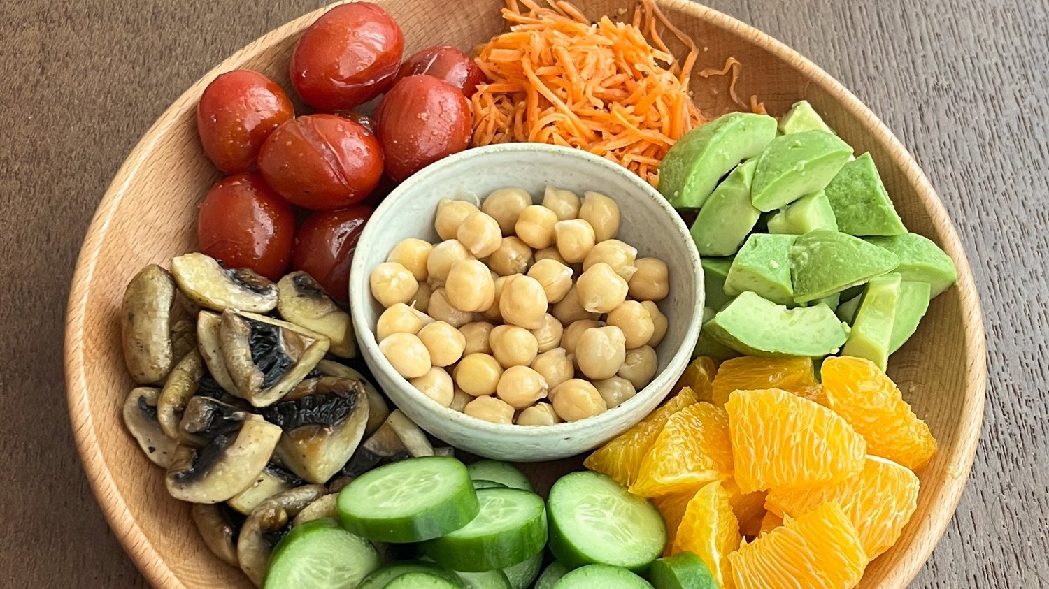 재료 아보카도 1개, 당근 2~3개, 방울토마토 한 줌, 스낵 오이 1개, 오렌지 1개, 올리브 오일, 발사믹식초, 메이플 시럽, 홀그레인 머스타드, 소금, 후추