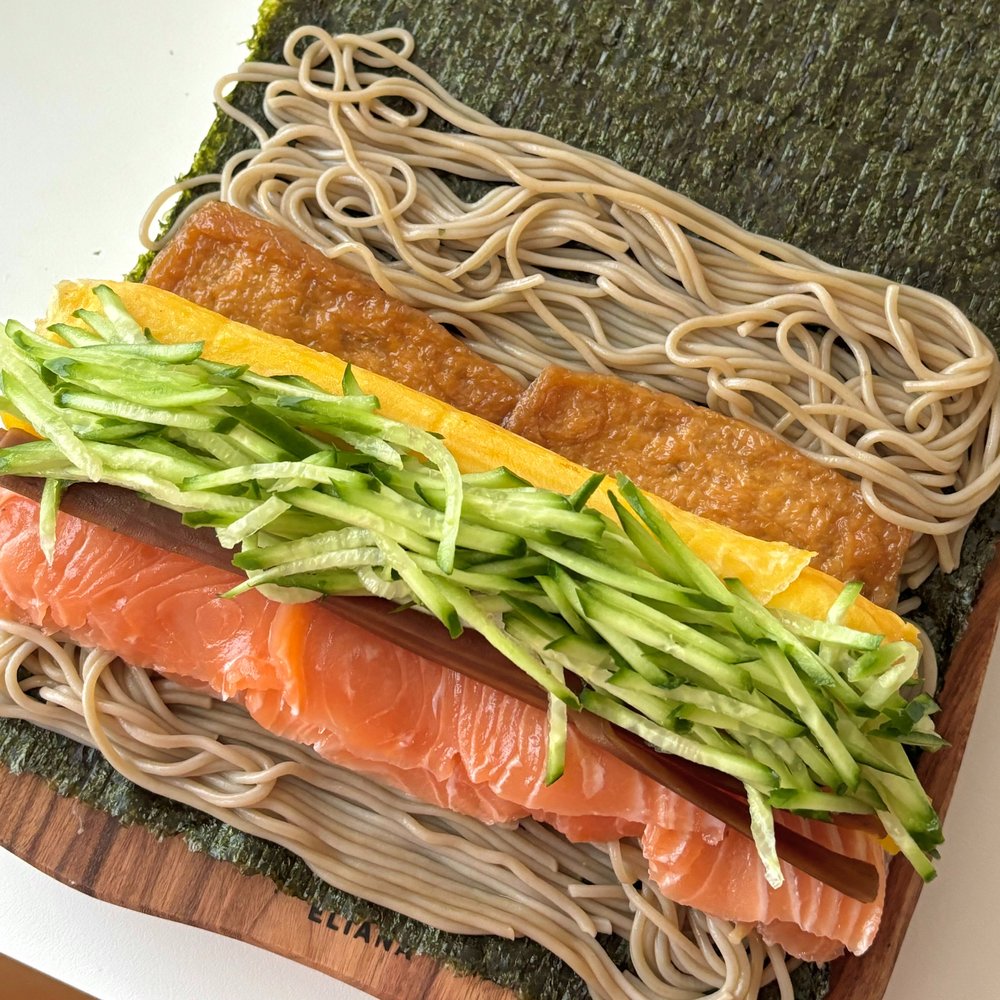 김밥김 1장과 반 장은 물기를 이용해 이어 붙여주고, 메밀면을 깔아준 뒤 연어, 계란말이, 유부, 단무지 1줄, 우엉 2줄, 오이까지 차곡차곡 쌓아 올려주세요. 김 끝부분에도 물기를 묻혀 말아주세요.