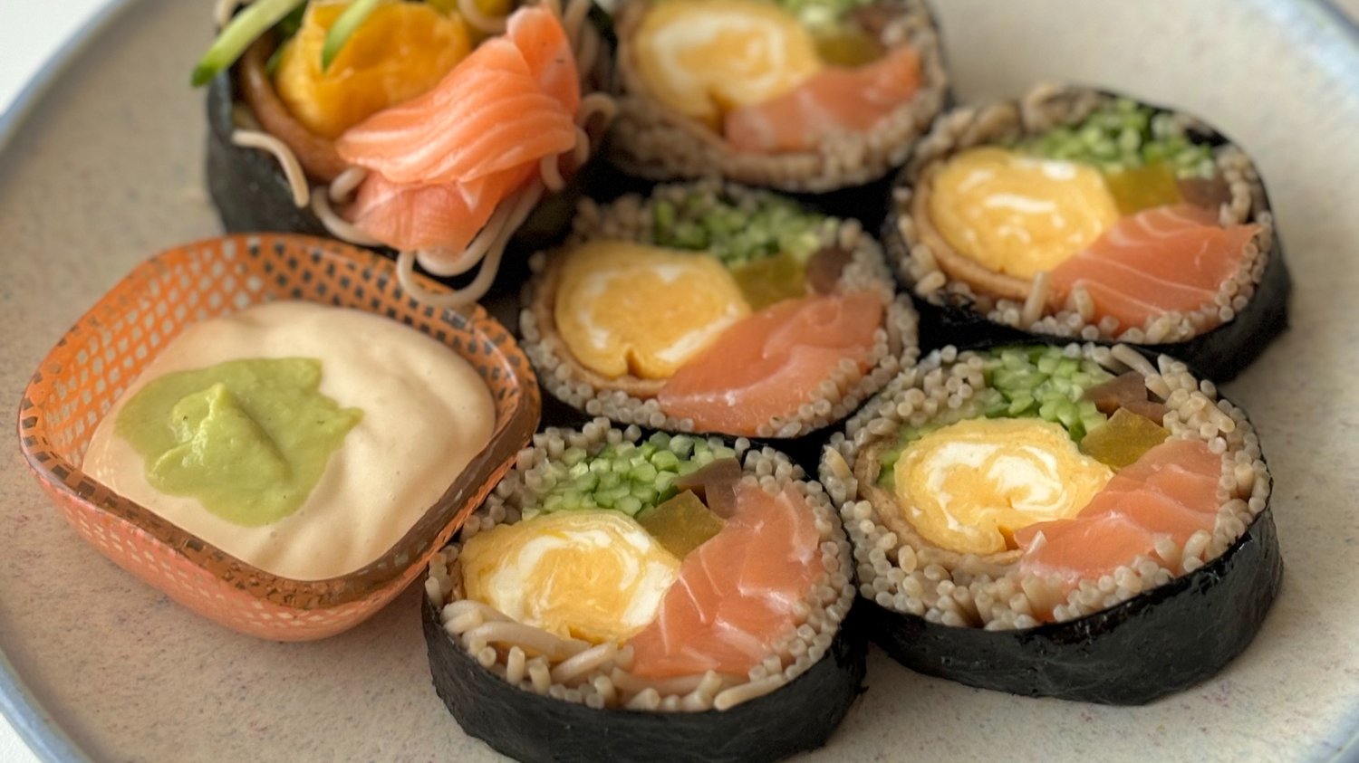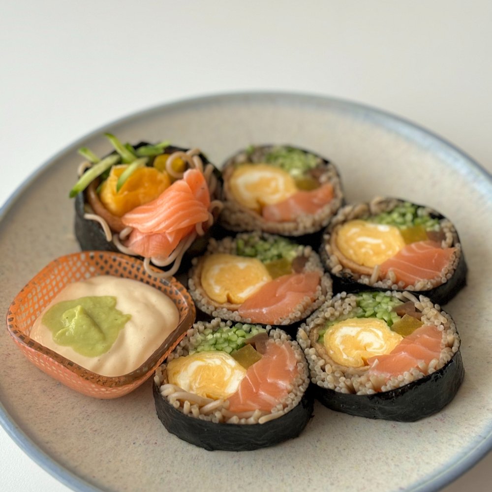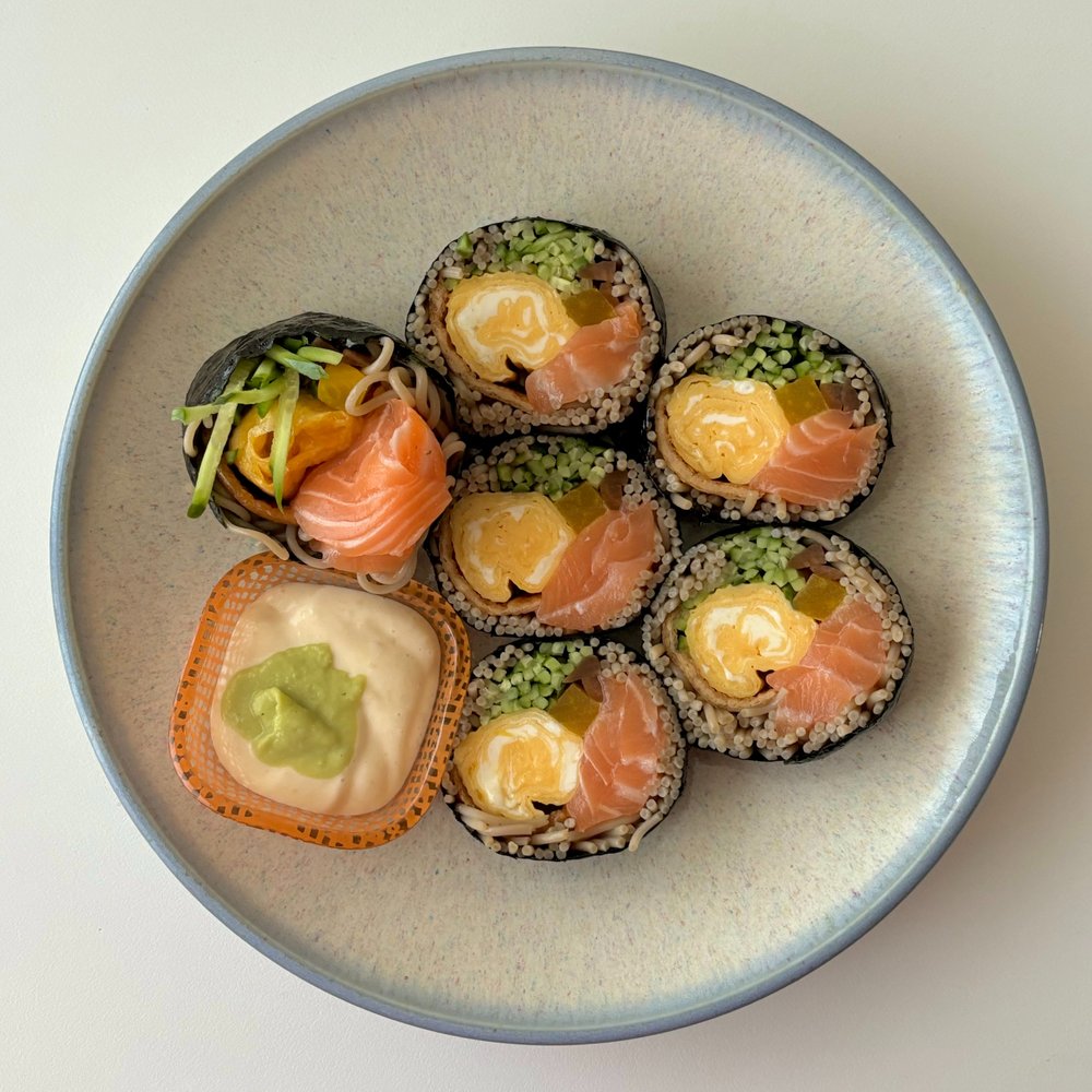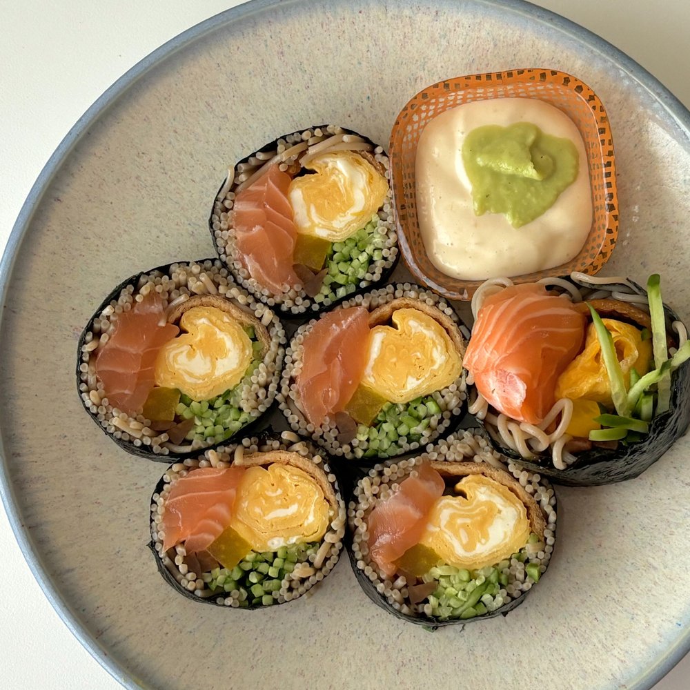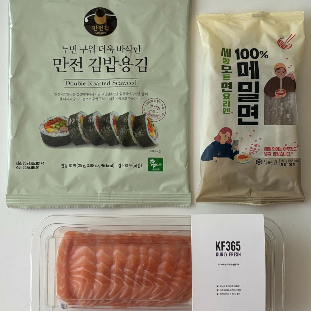 메밀면과 연어의 조합이 정말 좋은 김밥이에요. 개인적으로 연어김밥은 밥보다 메밀면이 2배 3배는 맛있네요. 🤤 메밀면의 은은한 향과 식감 덕분이에요. 그냥 먹어도 맛있지만, [KF365] 노르웨이 생연어회에 들어있던 홀스래디쉬소스와 생와사비를 곁들이면 더 맛있어요! 제가 좋아하는 홈메이드 와사마요 소스도 간단히 소개해 드릴게요!